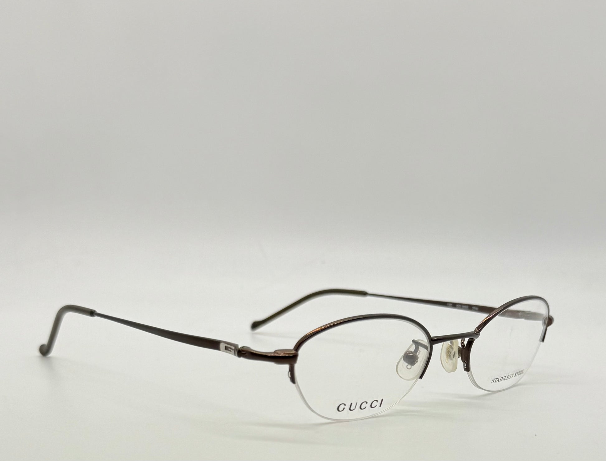 A rare half-rim (semi-rimless) Gucci optical frame from the Y2K era, featuring a delicate oval lens shape with a minimal bronze stainless-steel top bar and rimless lower edge.