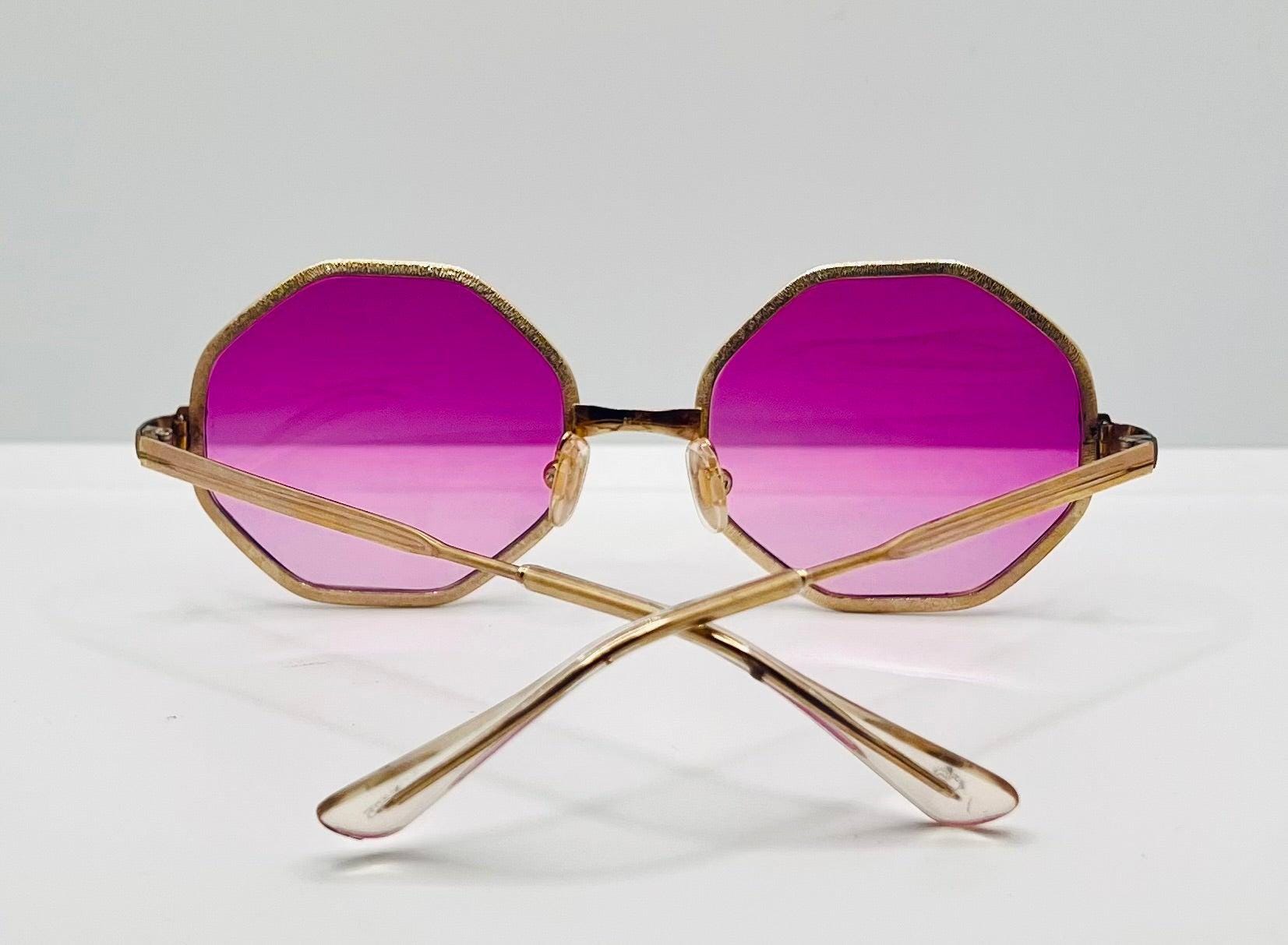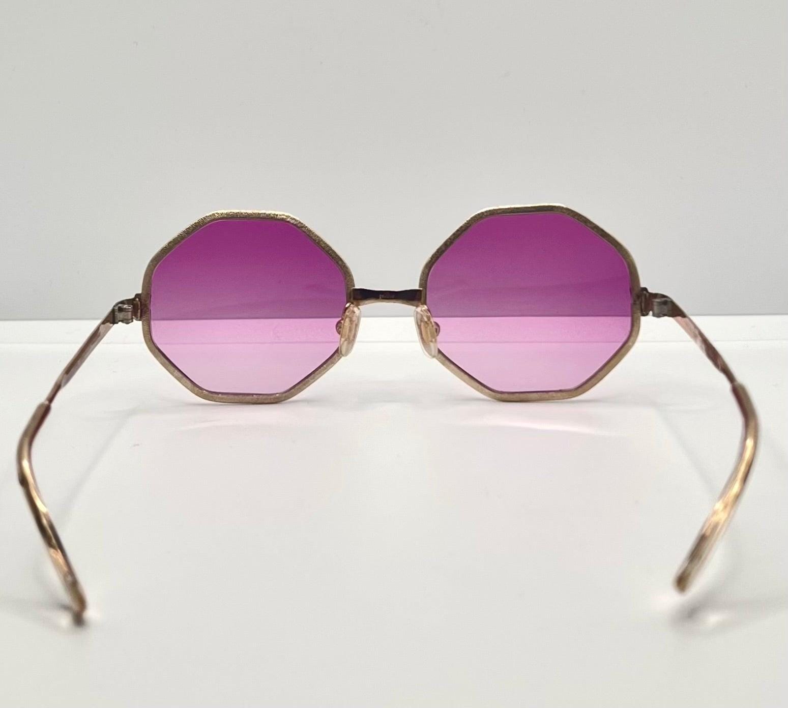 * Color: Gold-tone metal frame with original pink/purple tinted lenses