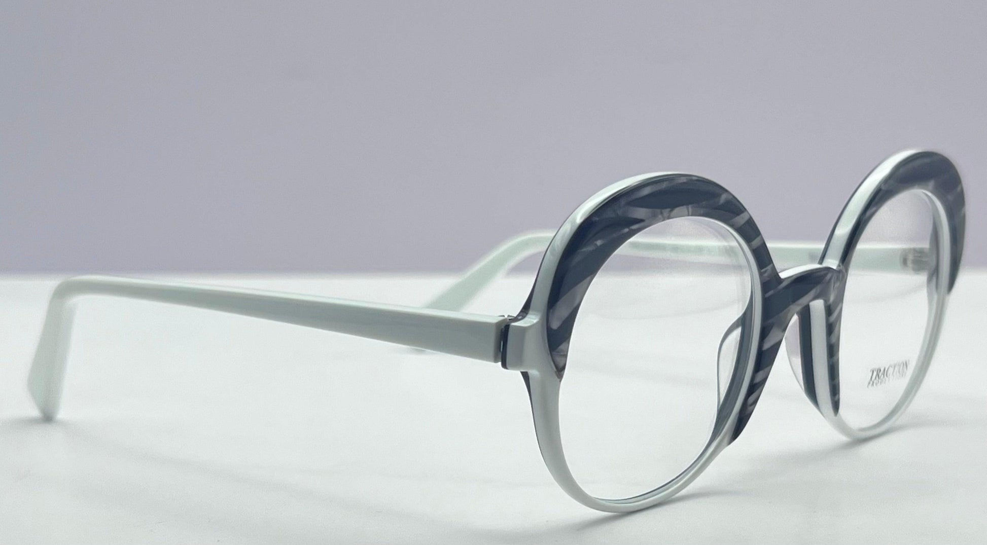 From the visionary minds at Traction Productions, the "Palmaria" model blends sculptural artistry with high-fashion minimalism. This handmade French frame features a bold round silhouette with a layered acetate design in white and black, offering a striking contrast from every angle.