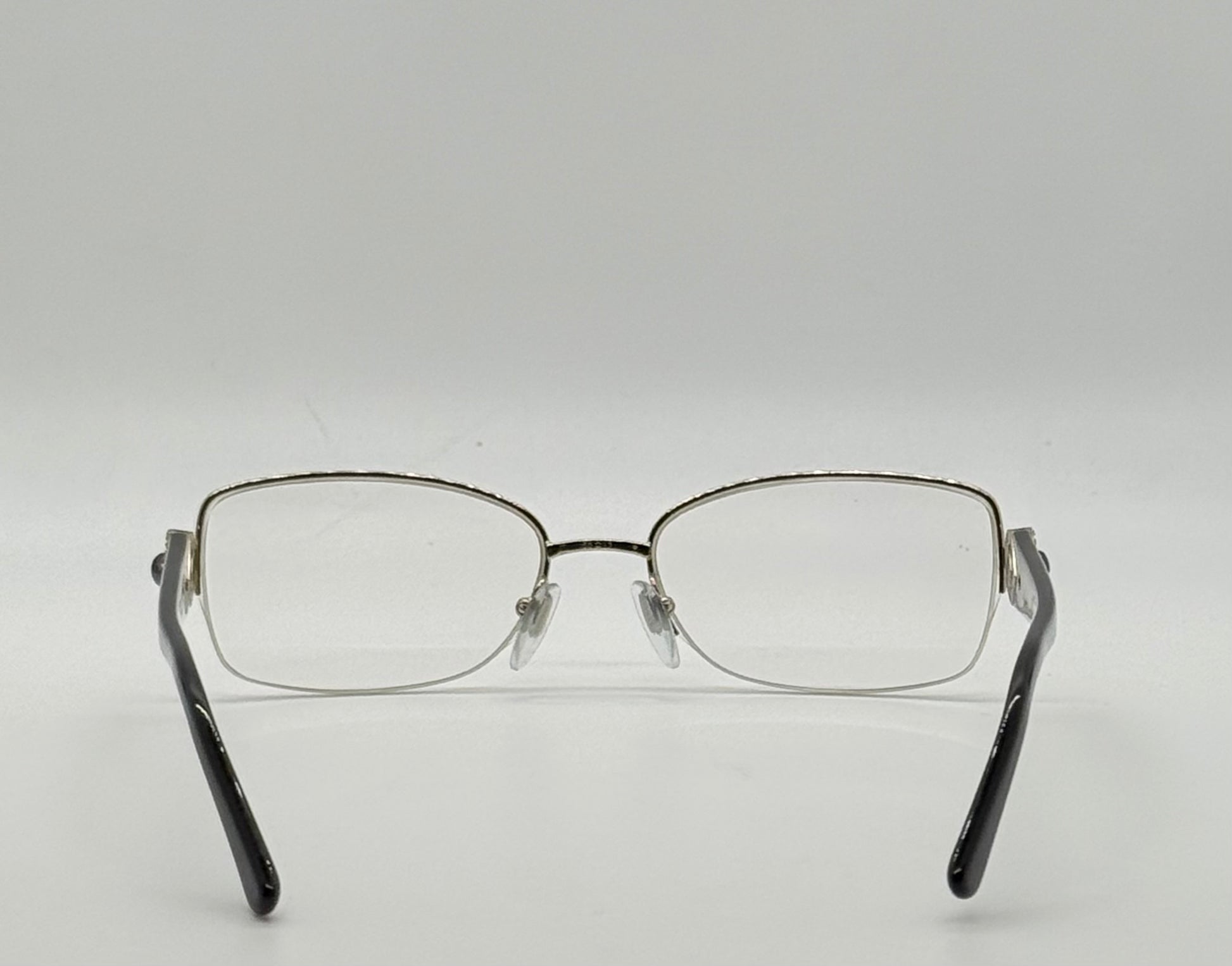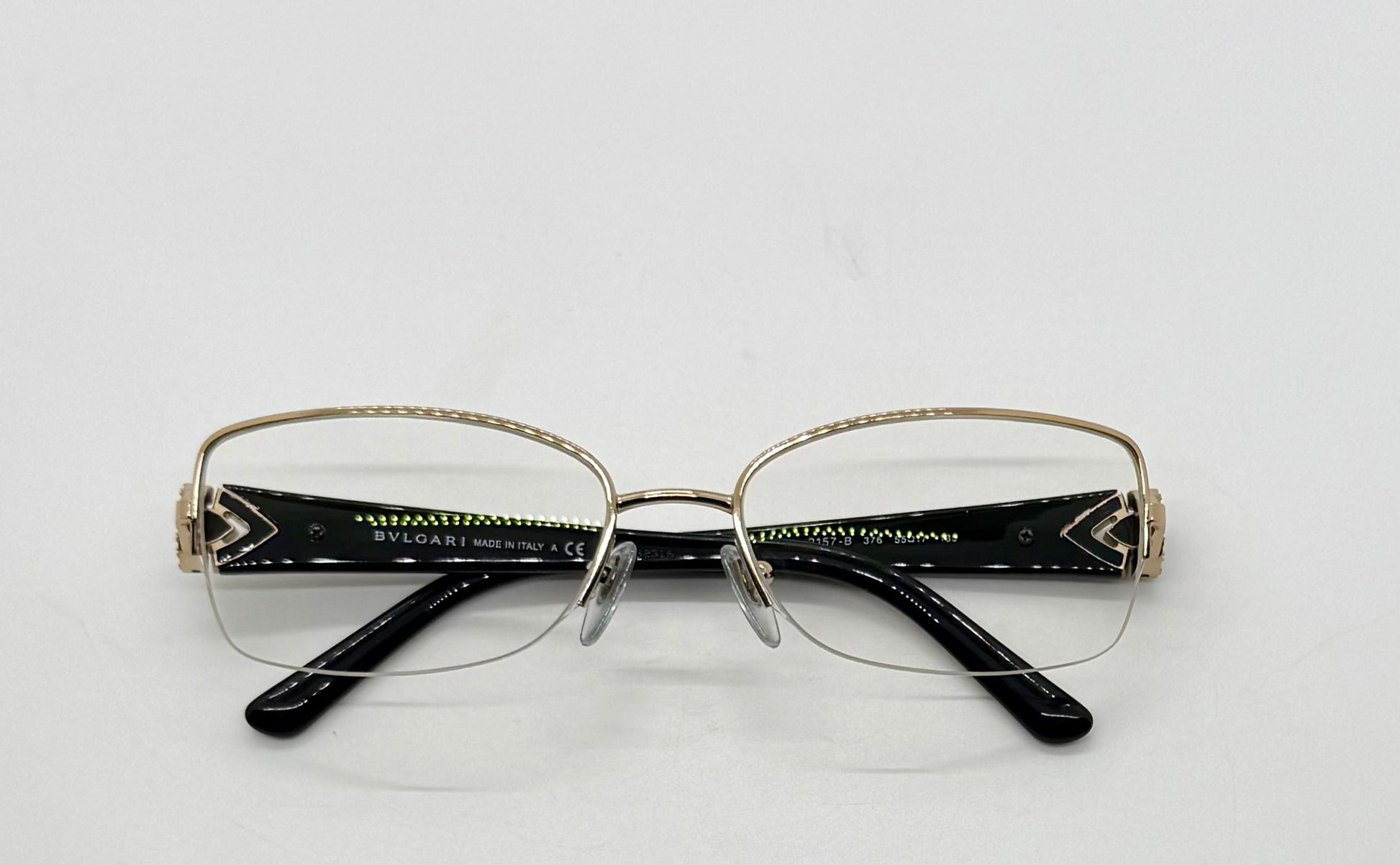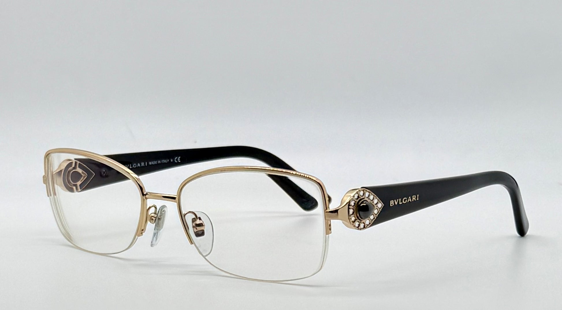 Elegant and architectural, these authentic BVLGARI optical frames feature a refined half-rim silhouette with gold-tone metal construction and signature BVLGARI jewel-inspired temple hardware. A timeless luxury optical piece designed for customization.