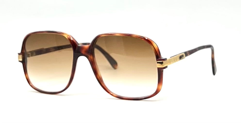 Warm tortoise acetate construction with gold-tone temple hardware and signature oval Cazal logo plaque.