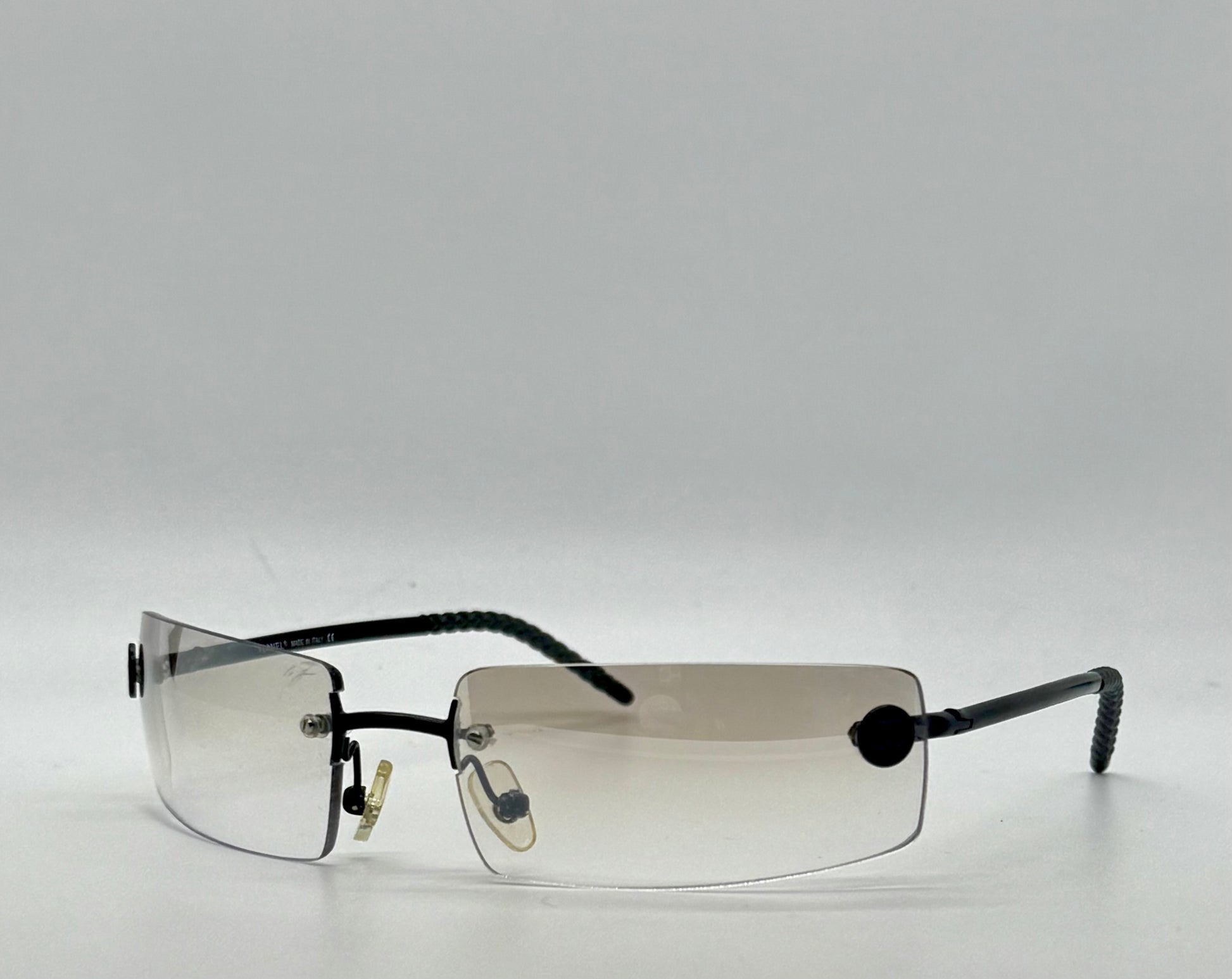 This model is part of Chanel’s early-2000s rimless era — known for bold rectangular lenses mounted through signature oversized double-C disc hardware.