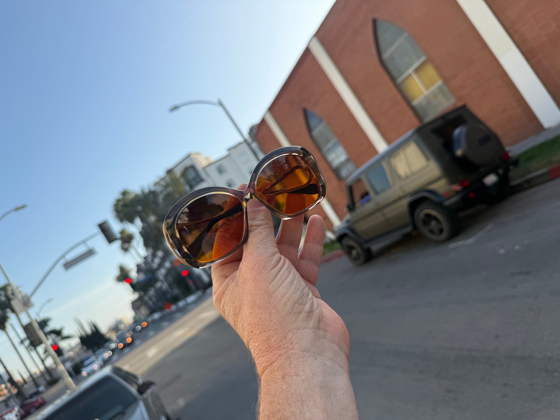 Oversized but structured. Flattering on medium to larger faces and strong on-camera.