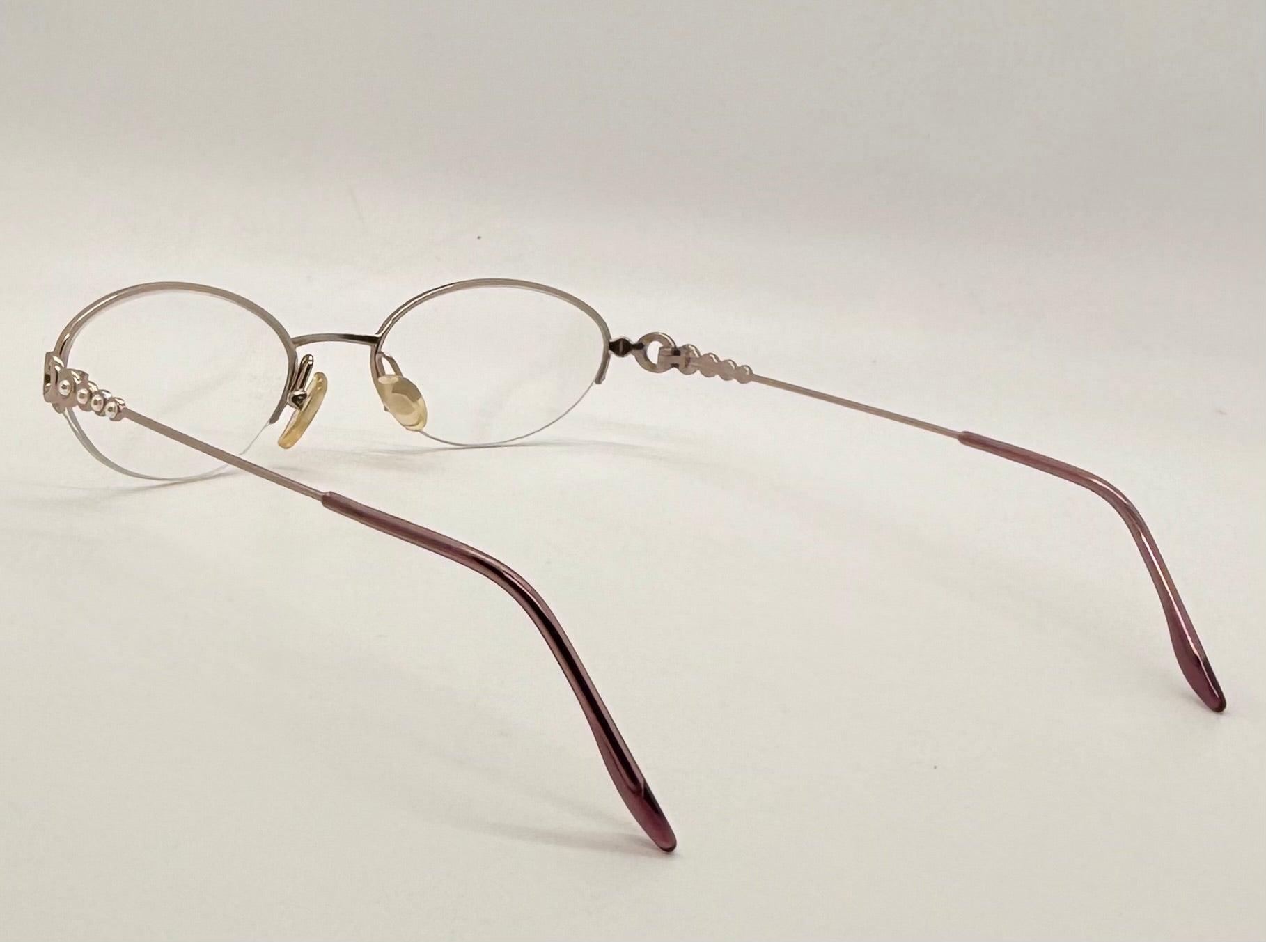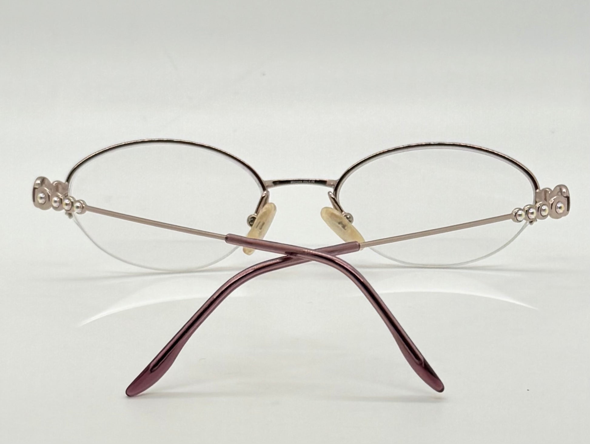 Authentic, never-worn Christian Dior optical frames from the late 1990s / early 2000s Y2K era. Ultra-delicate half-rim design in a champagne gold / rose gold tone, elevated by Dior’s signature jewelry-inspired temple work and iridescent cabochon detailing. A rare micro-oval silhouette that defines early-2000s luxury eyewear.