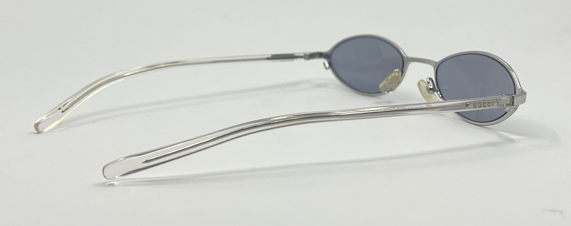 Unworn and authentically Italian-made Gucci GG1608/S sunglasses featuring a polished silver oval metal frame that captures the futuristic minimalism of the Y2K era. Slim temples with engraved GUCCI logos create a clean and balanced silhouette that feels both refined and collectible.