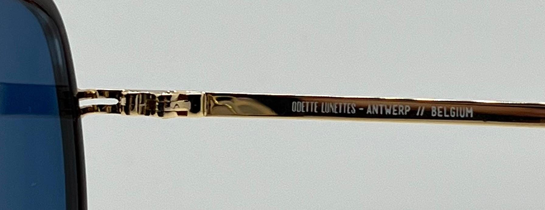 A stunning expression of modern European artistry with vintage-inspired sophistication. The Odette Lunettes “Trent” C308, designed in Antwerp, Belgium, combines bold geometric structure with refined detailing. Handcrafted with a polished gold-tone metal frame, tortoiseshell brow bar, and custom blue lenses, this piece exemplifies contemporary elegance and timeless wearability.