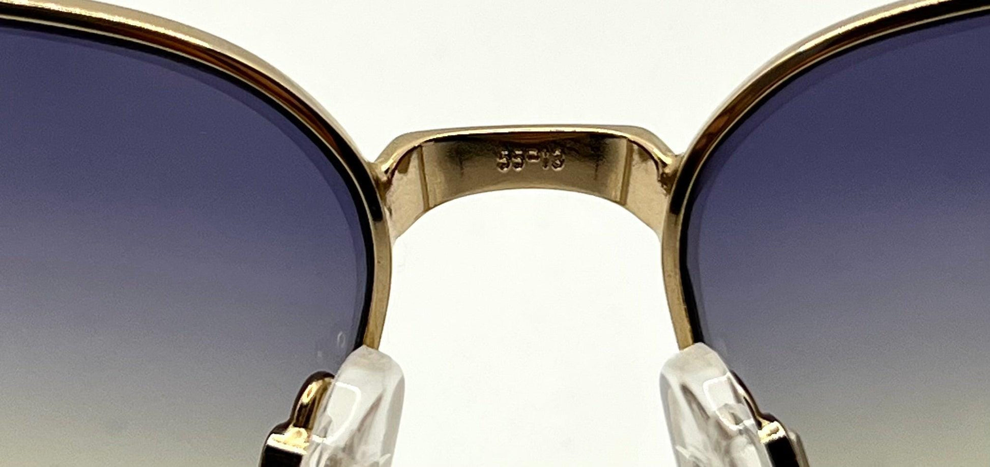 * Angular geometric gold frame with signature enamel inlay on the temples