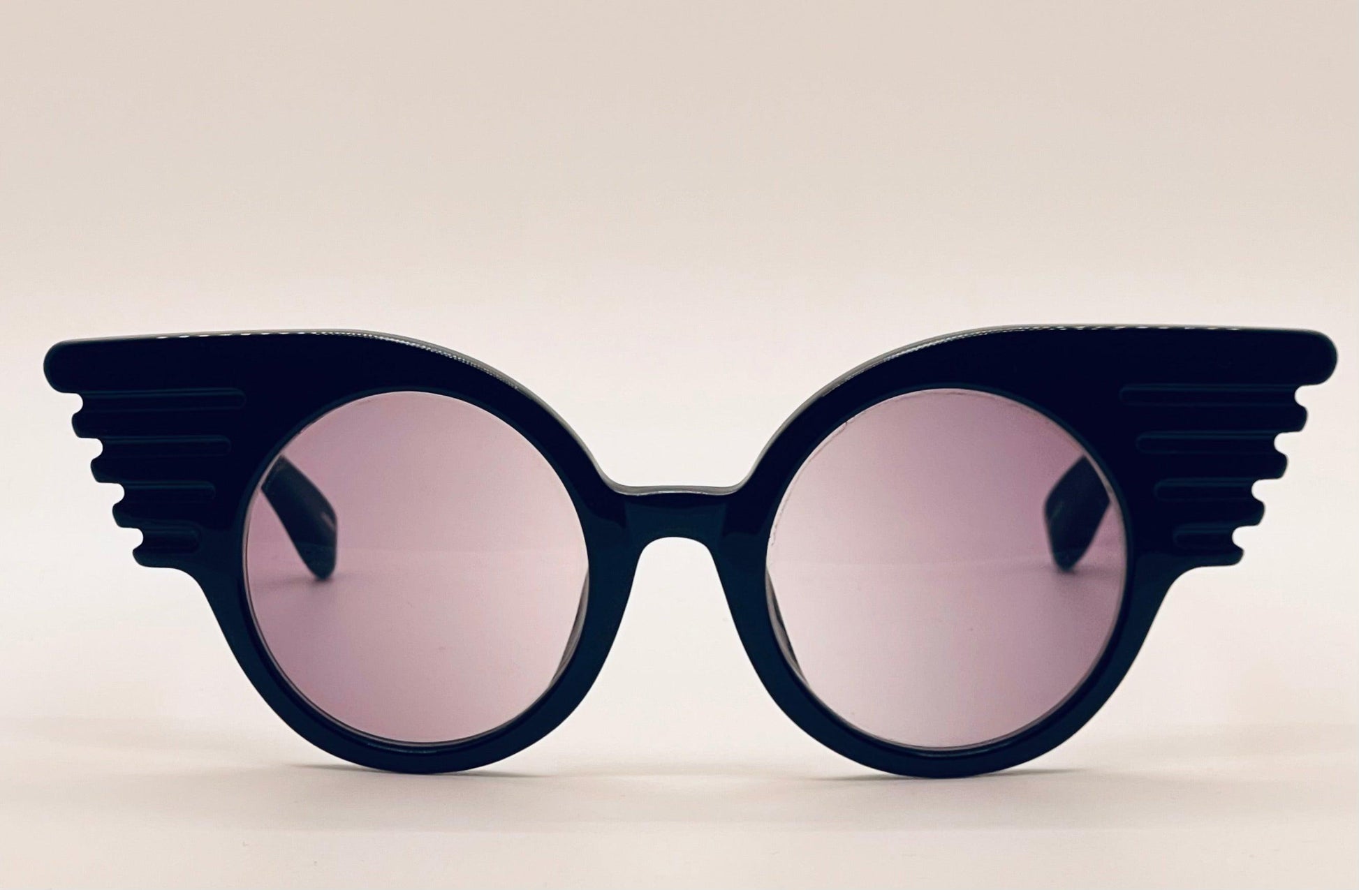 Vintage NOS Linda Farrow Projects x Jeremy Scott JS/WINGS/2 Handmade Black Sunglasses with Purple Gradient Lenses