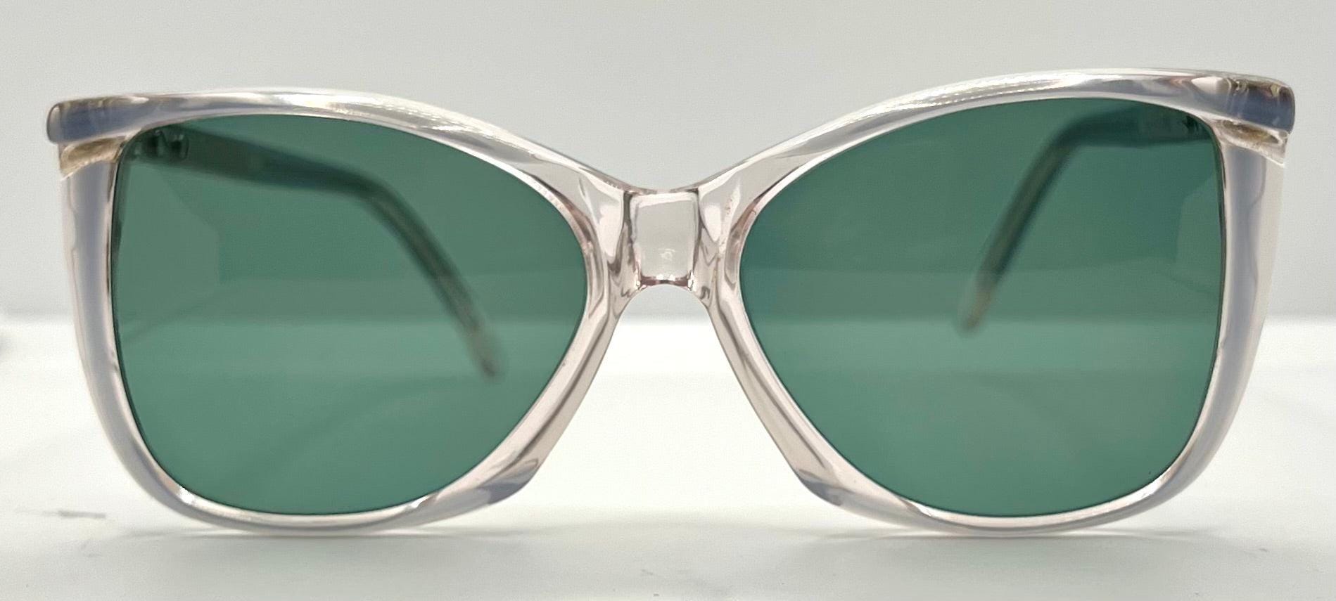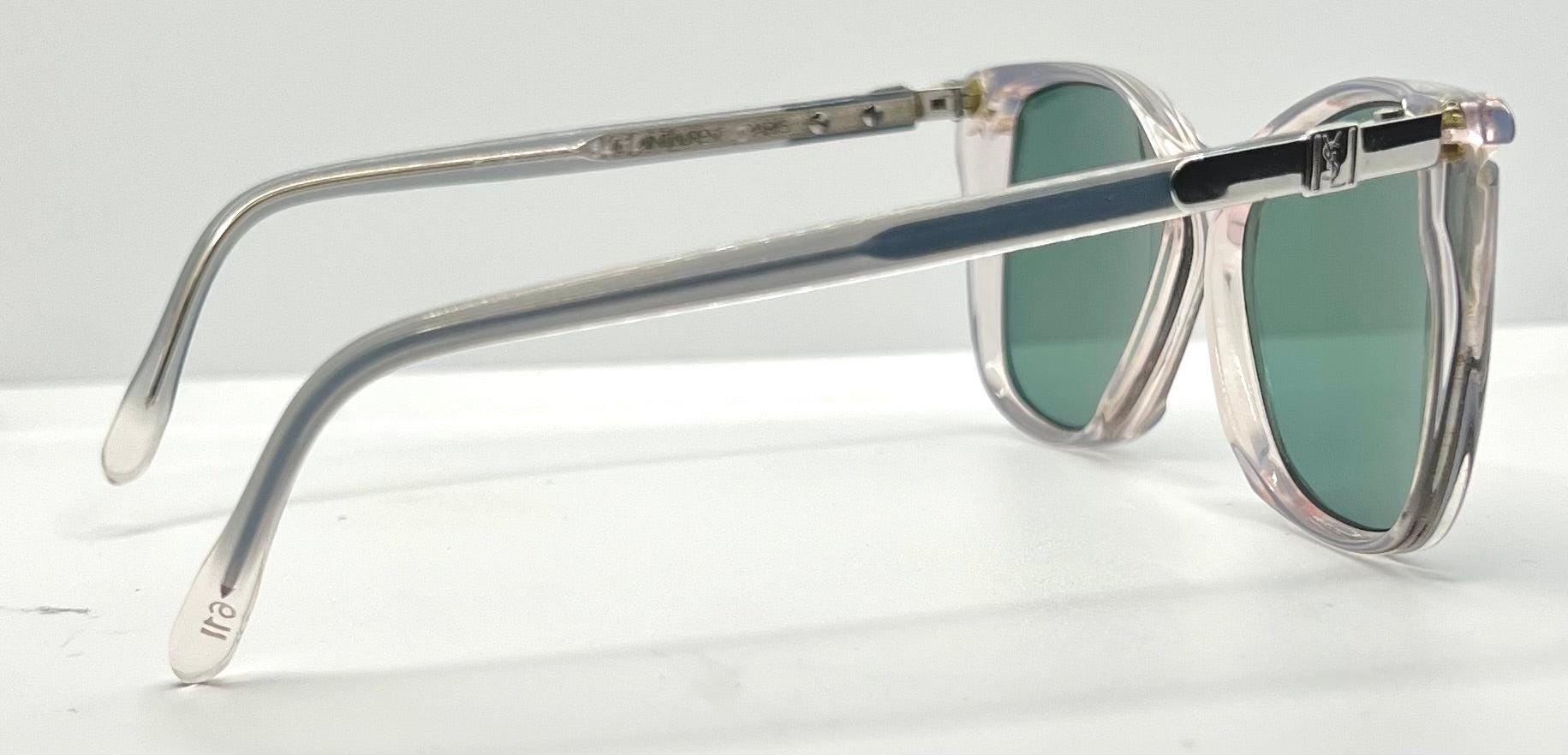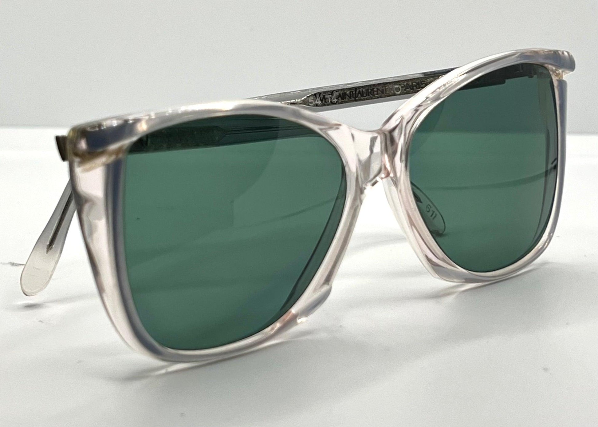 An authentic vintage treasure from the golden age of Yves Saint Laurent eyewear, these SL 611 sunglasses in rare clear grey crystal are in deadstock condition and have been expertly customized with new solid green lenses by Second Chance Customs.