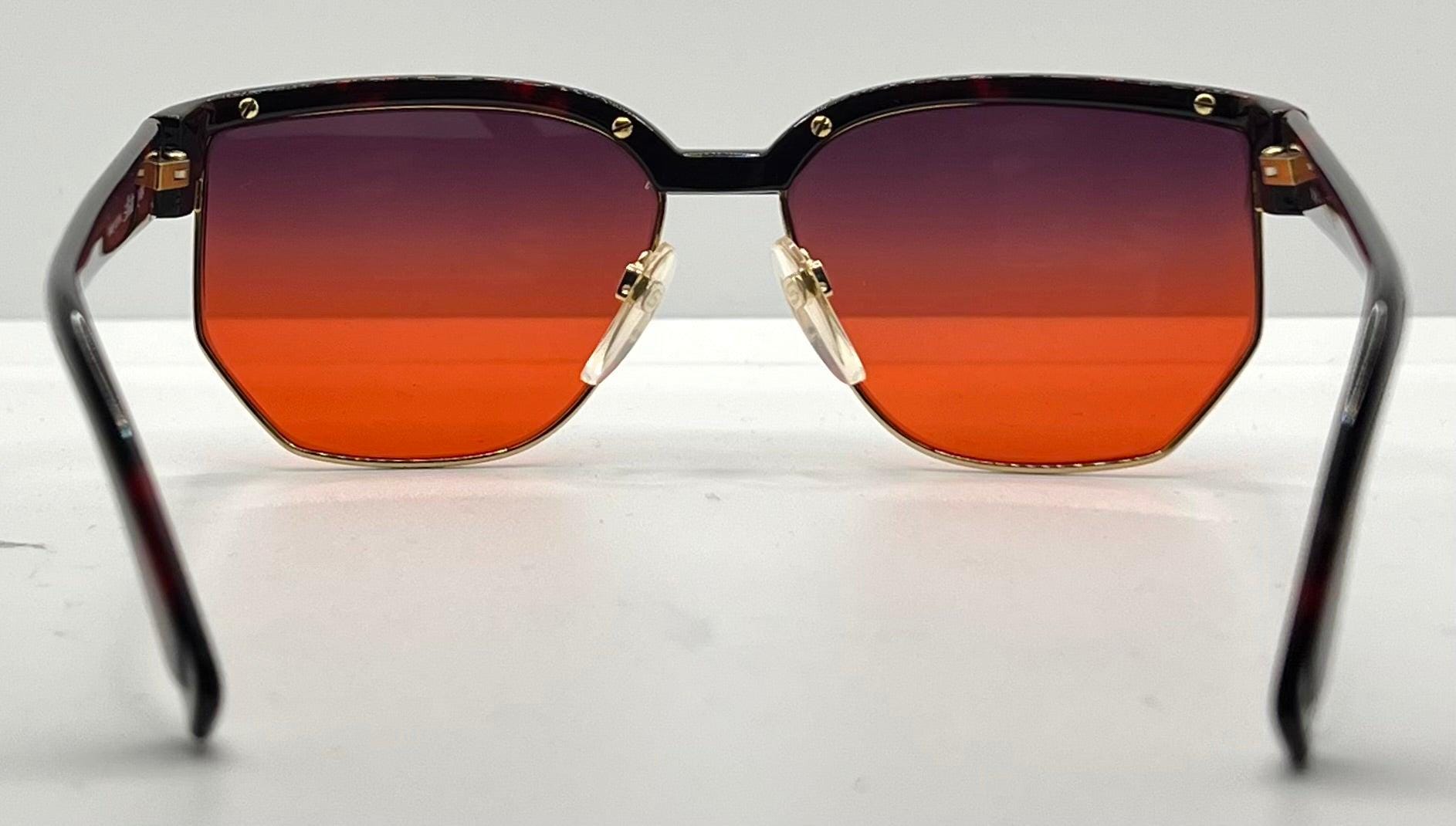 This rare Deadstock find from Silhouette showcases the bold, architectural design language of late-80s/early-90s Austrian eyewear. The V6054 M6067 model features a deep tortoise acetate browline and angular gold-rimmed lenses with unique geometric cuts. These frames have been fitted with brand new Second Chance Customs sunset gradient lenses that shift from rich violet to a fiery orange, offering both standout style and UV protection. A true collector's piece reimagined for modern wear.