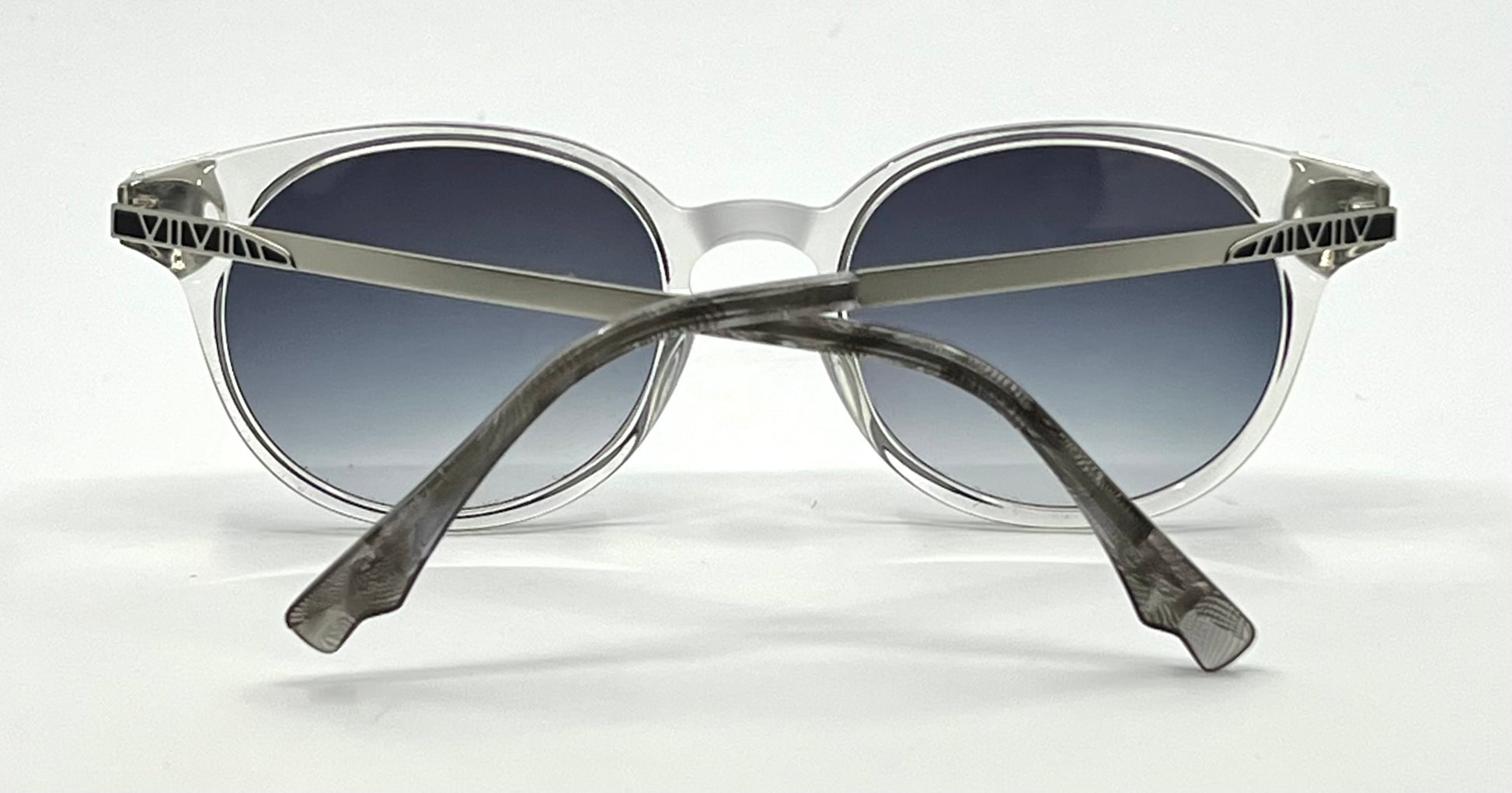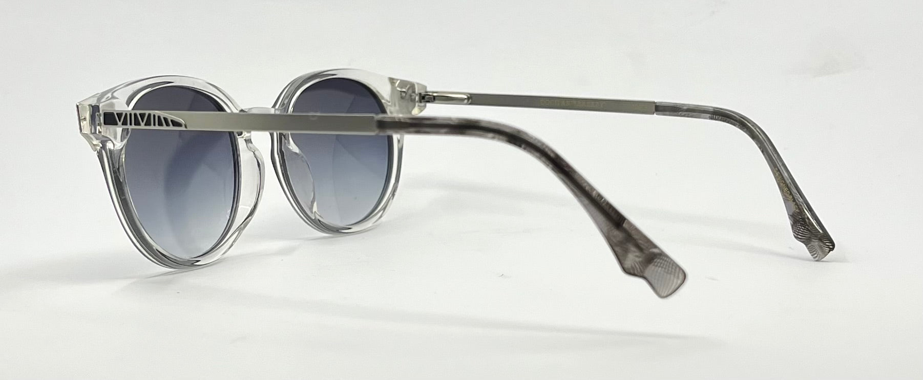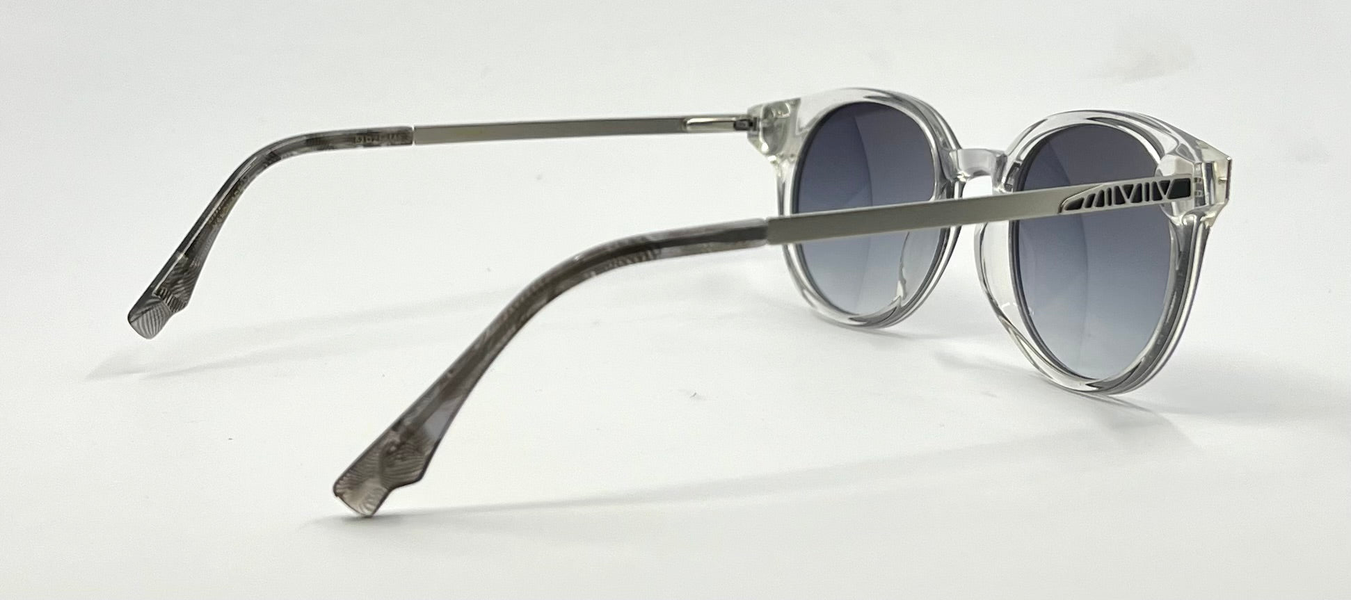 Unworn Deadstock Coco and Breezy 10001 sunglasses from the brand’s early designer era (2010s) — a period that helped define independent luxury eyewear in New York. This distinctive piece features a transparent crystal acetate front paired with brushed silver metal temples etched with geometric detailing, echoing the brand’s architectural and art-driven aesthetic.