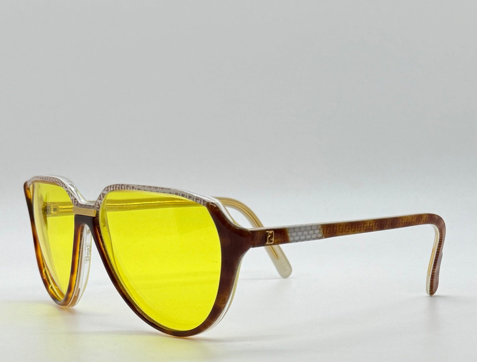 This striking oversized frame is a rare late 1980s to early 1990s collaboration between two legendary Italian brands: Fendi and Lozza. Lozza, founded in 1878, is Italy's oldest eyewear company, known for its master craftsmanship. During this pre-LVMH era, Fendi commissioned Lozza to produce frames under joint branding, a short-lived and highly sought-after partnership in the vintage eyewear community.The model FV48 showcases a distinctive shield-meets-aviator silhouette, with a geometric bridge and a deep amber tortoise outer frame wrapped around translucent yellow arms. The browline is embossed with repeating Fendi Zucca monograms, blending opulence with architectural precision.