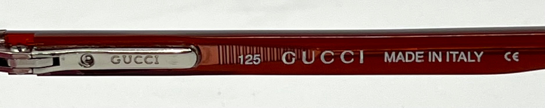 - Red translucent acetate temples featuring metal hinge plates engraved “GUCCI.”