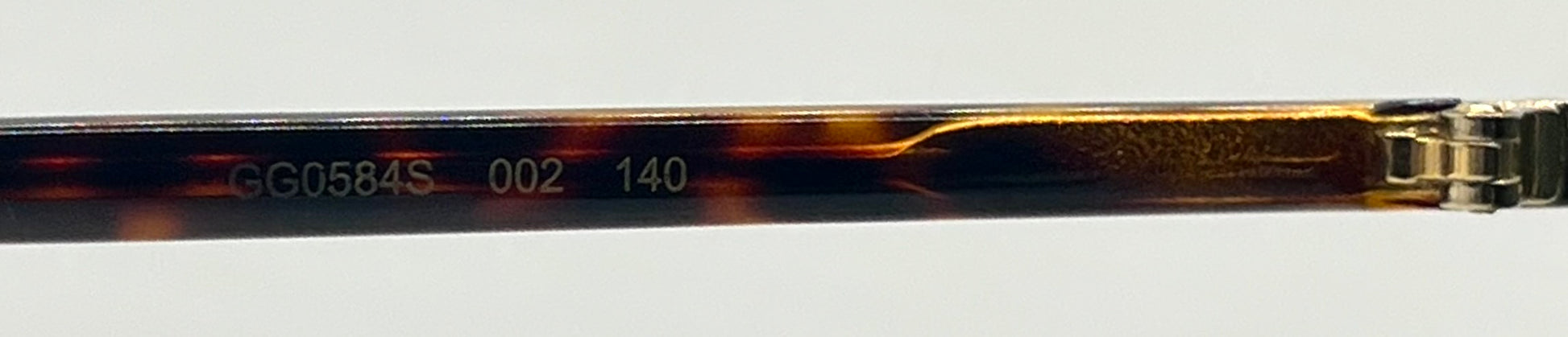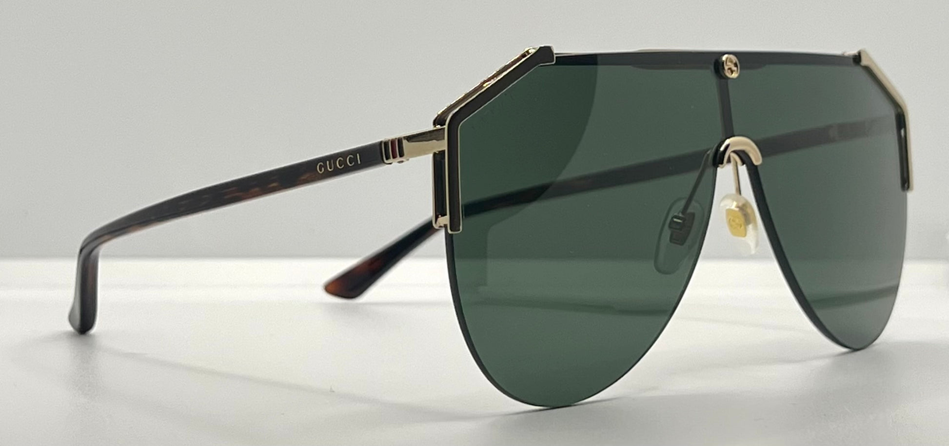 The Gucci GG0584S offers a bold, contemporary shield silhouette with luxury finishes, blending high-fashion aesthetics with functional sun protection. The combination of gold metal, tortoise temples, and green lenses adds timeless sophistication. Highly sought after for its distinctive geometric brow design and premium construction, this model remains a favorite among collectors and style-conscious wearers.