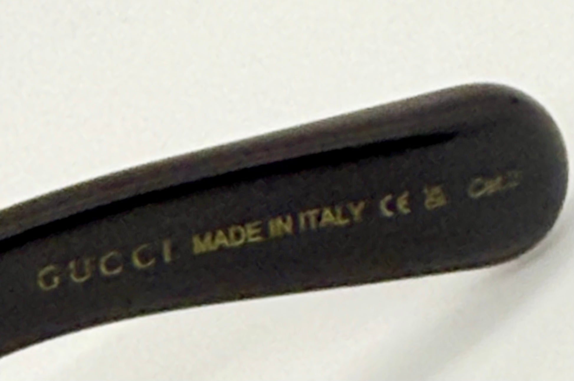 A striking unworn deadstock Gucci statement frame featuring bold sculpted acetate, wide architectural temples, and polished gold GG hardware. While the silhouette draws from vintage glamour, this is a modern-era Gucci design, made in Italy and preserved in pristine, unused condition.