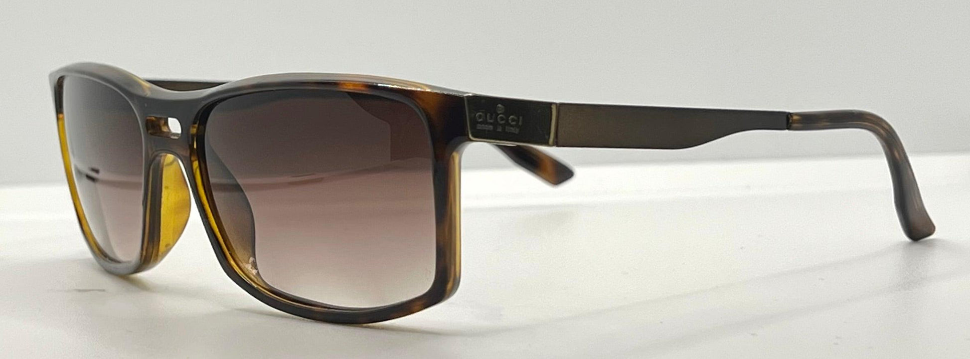 Preowned and fully refurbished, this pair of Gucci GG1588/S QZUEJ sunglasses offers a timeless, wraparound silhouette with vintage Italian luxury craftsmanship and a bold yet versatile tortoise finish.