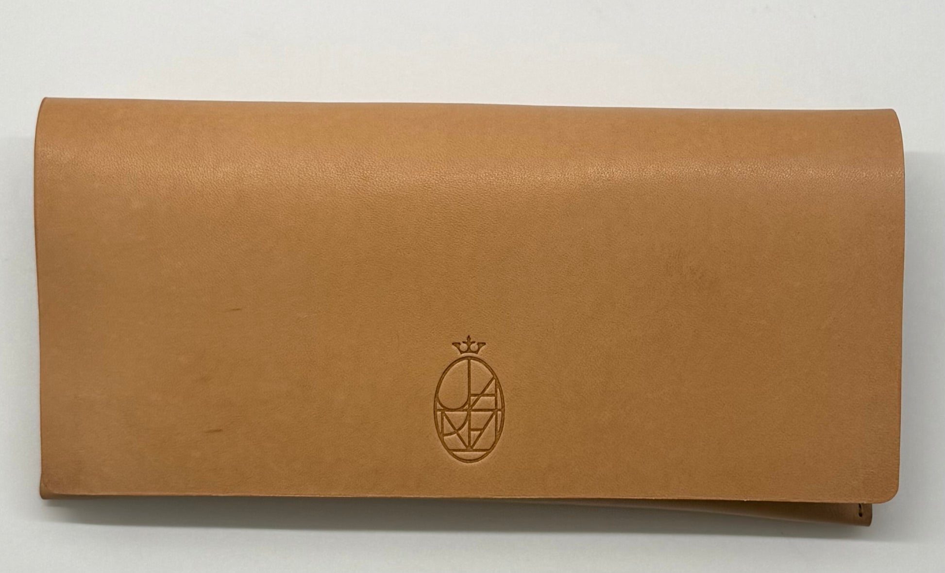 This is a factory-original Jacques Marie Mage case, produced using traditional Italian leatherworking methods. The vegetable-tanned leather is intentionally left untreated to age naturally over time, while the burgundy suede interior is designed to protect acetate and precious metal frames.