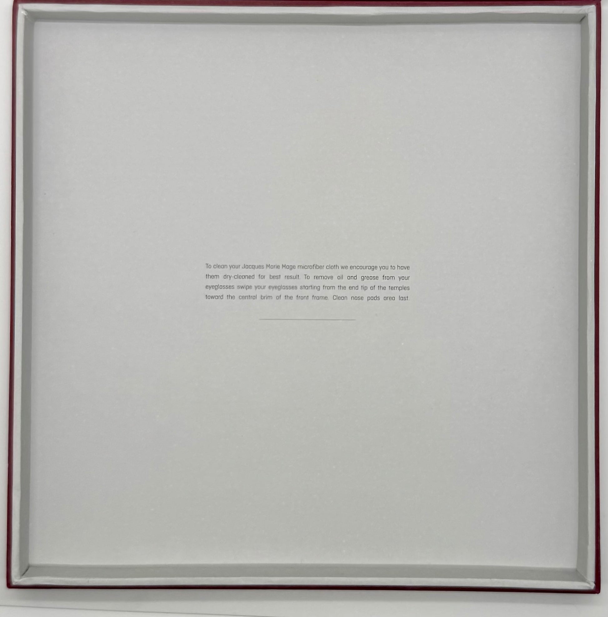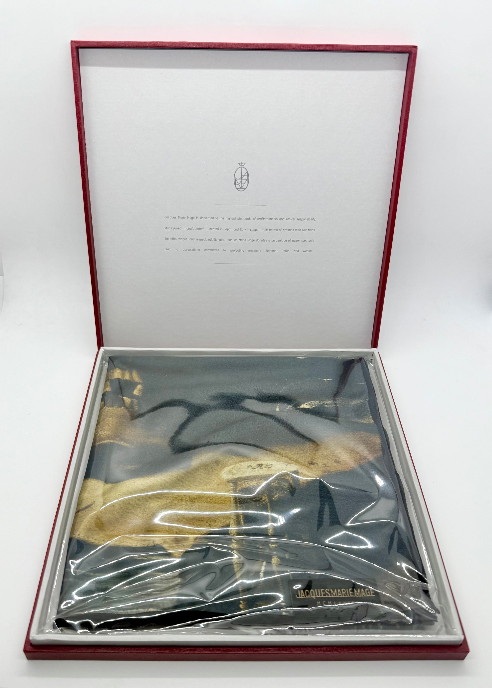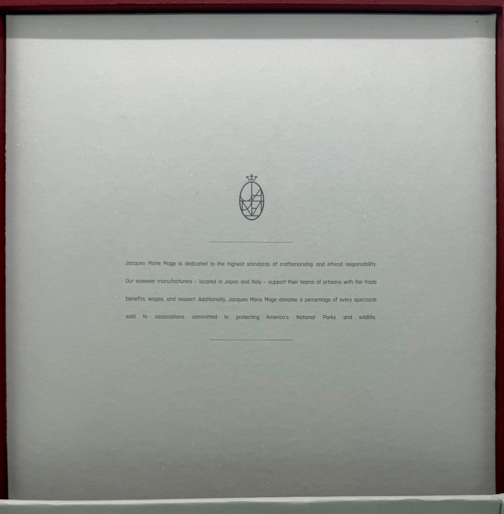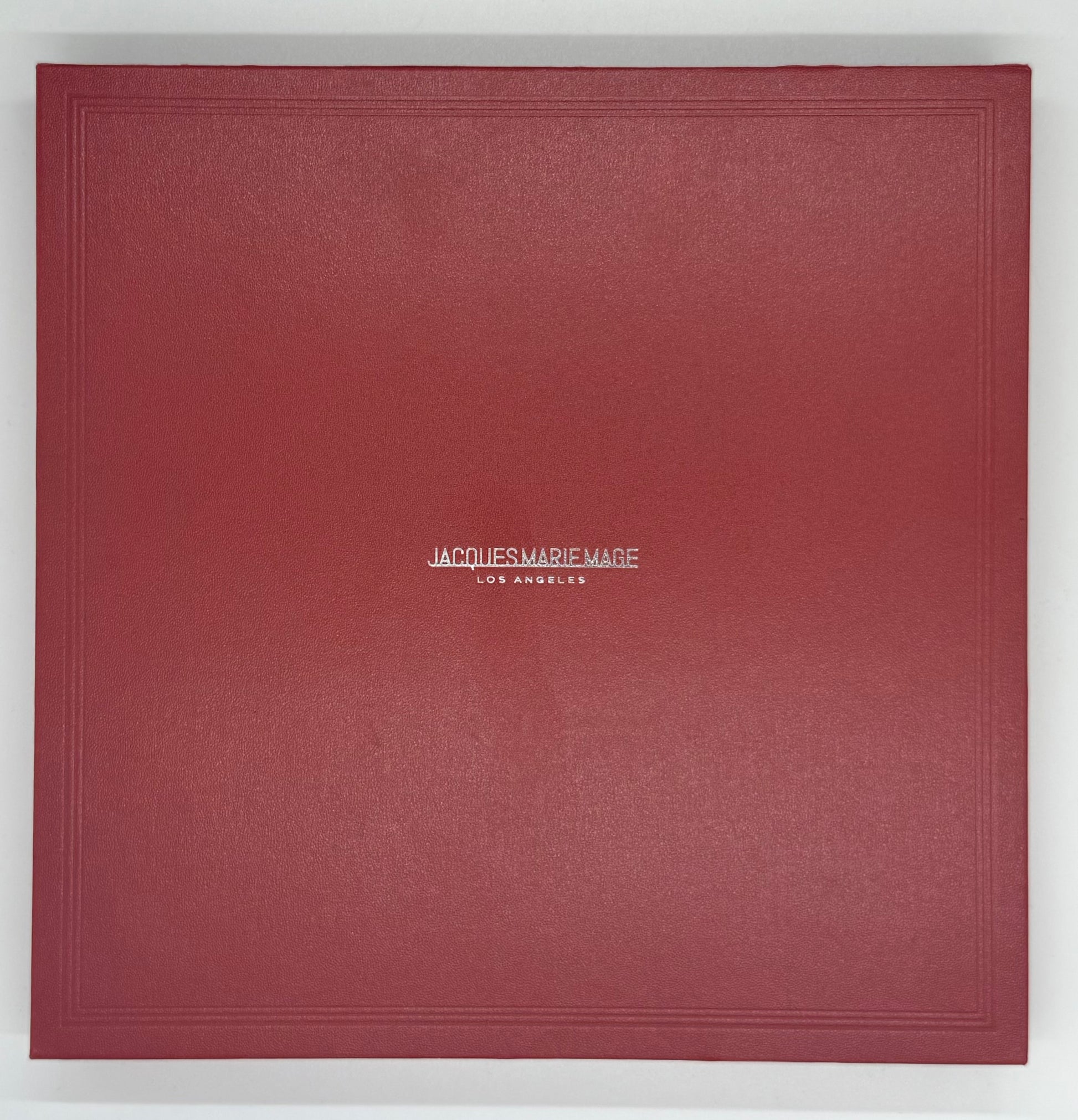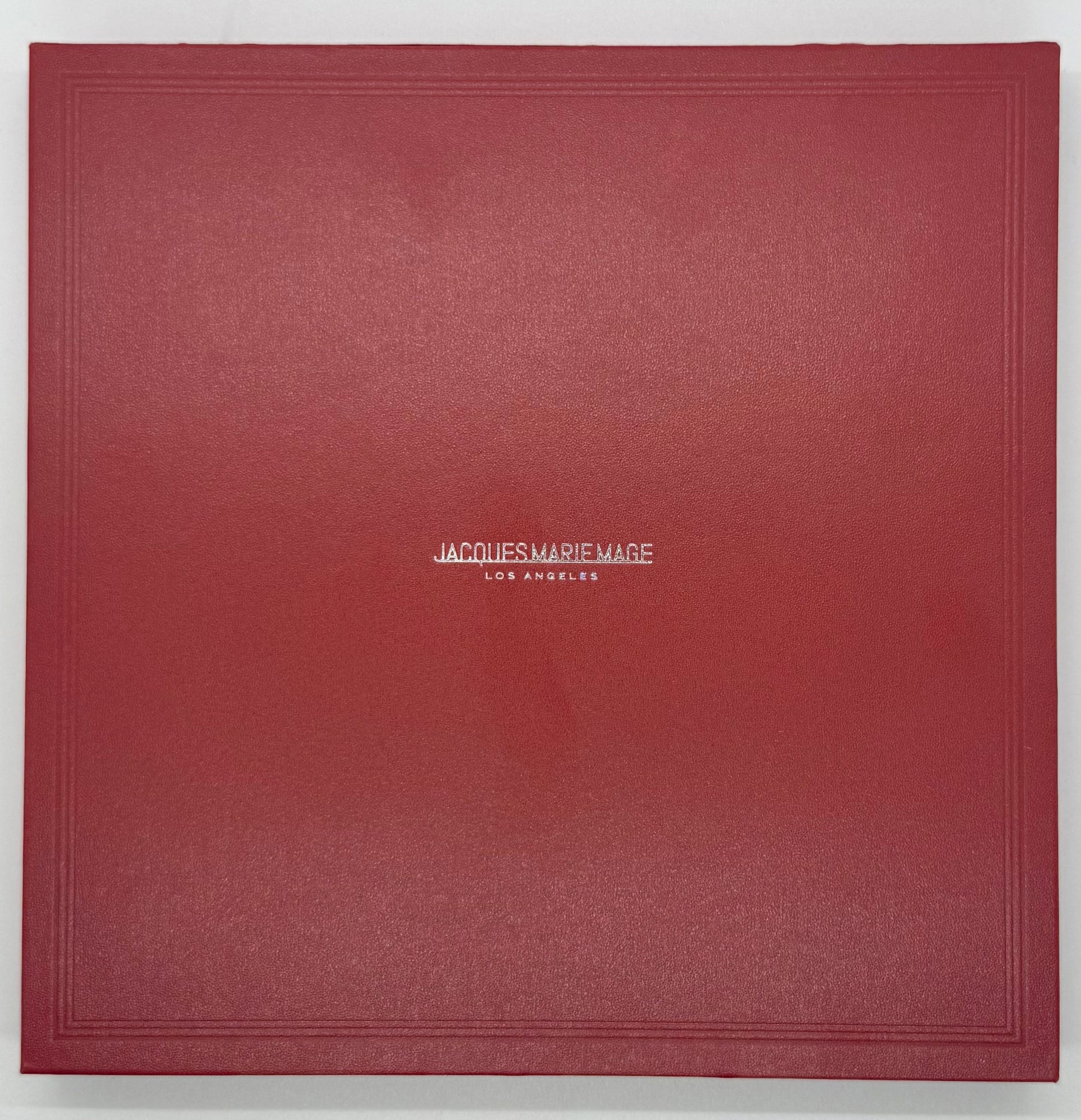 Presented in the original Jacques Marie Mage deep red embossed box with silver logo detailing, containing printed inner liners describing JMM’s commitment to ethical craftsmanship and artistry