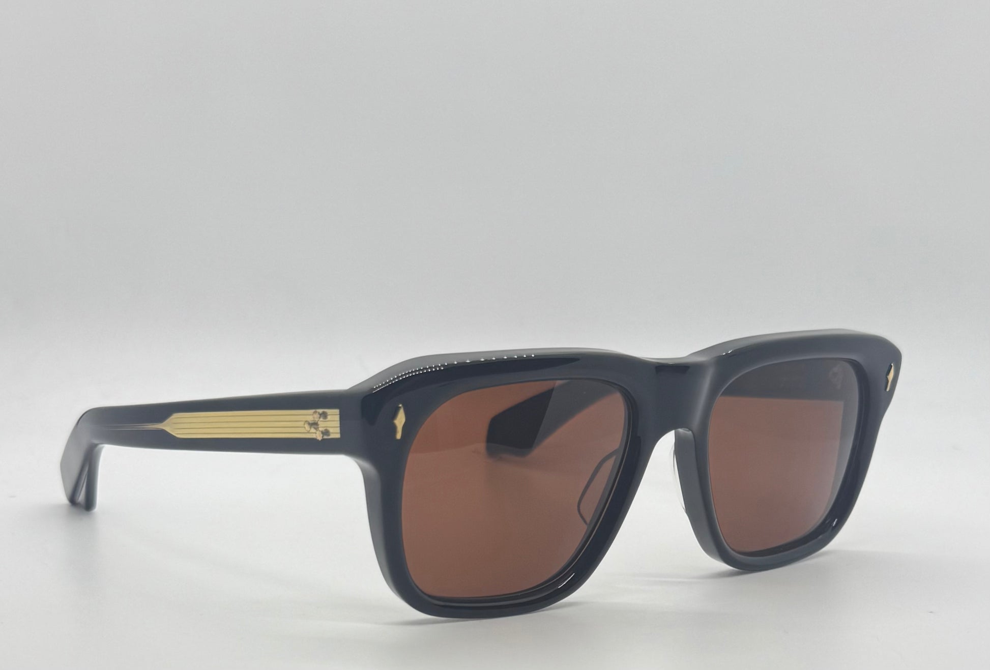 The Eclipse colorway combines a deep black acetate with a subtle cured translucence that shifts tone under light—paired with Dark Gold hardware, custom hairline-engraved wire core, and spur-shaped rivet hinges. The result is a statement piece that balances architectural strength with tailored sophistication.