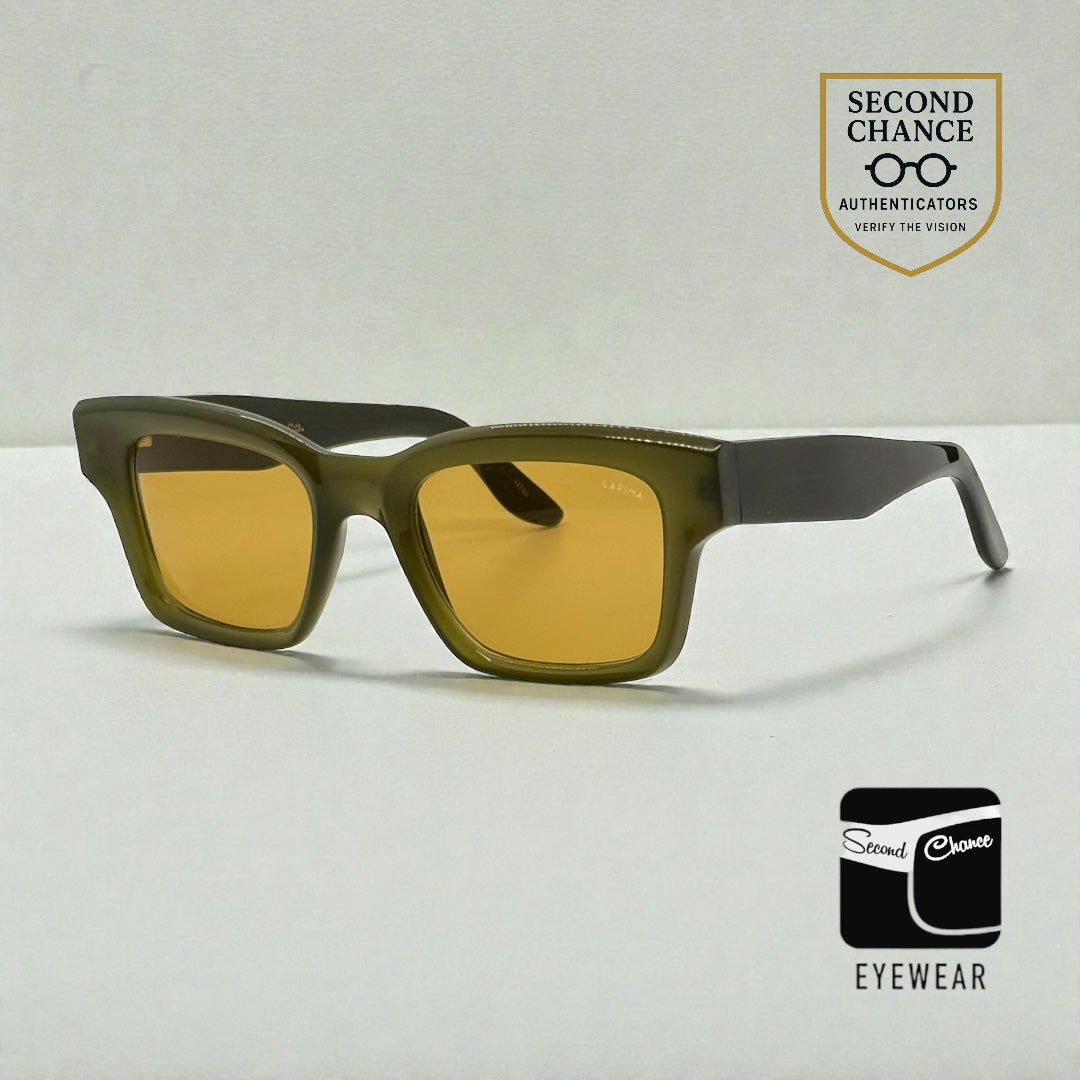 Produced in a run of only 25 pieces worldwide, this is the X Collection “Joaquim”, featuring a sculptural rectangular silhouette crafted in deep olive acetate and fitted with original LAPIMA lenses.