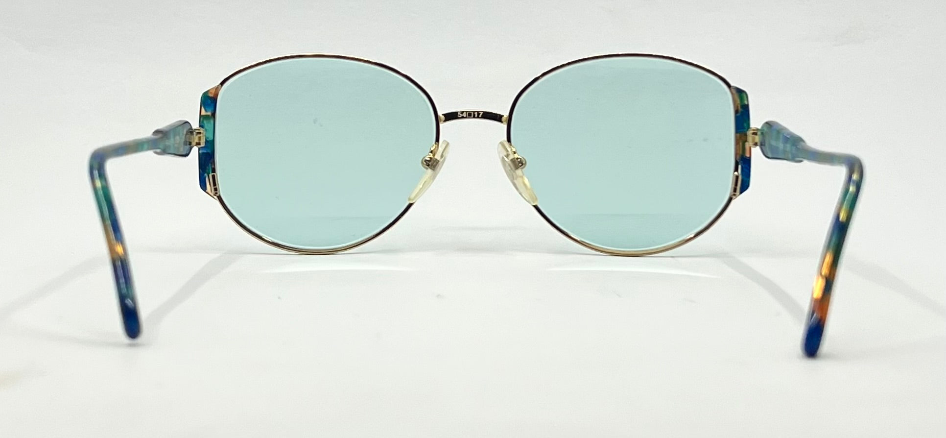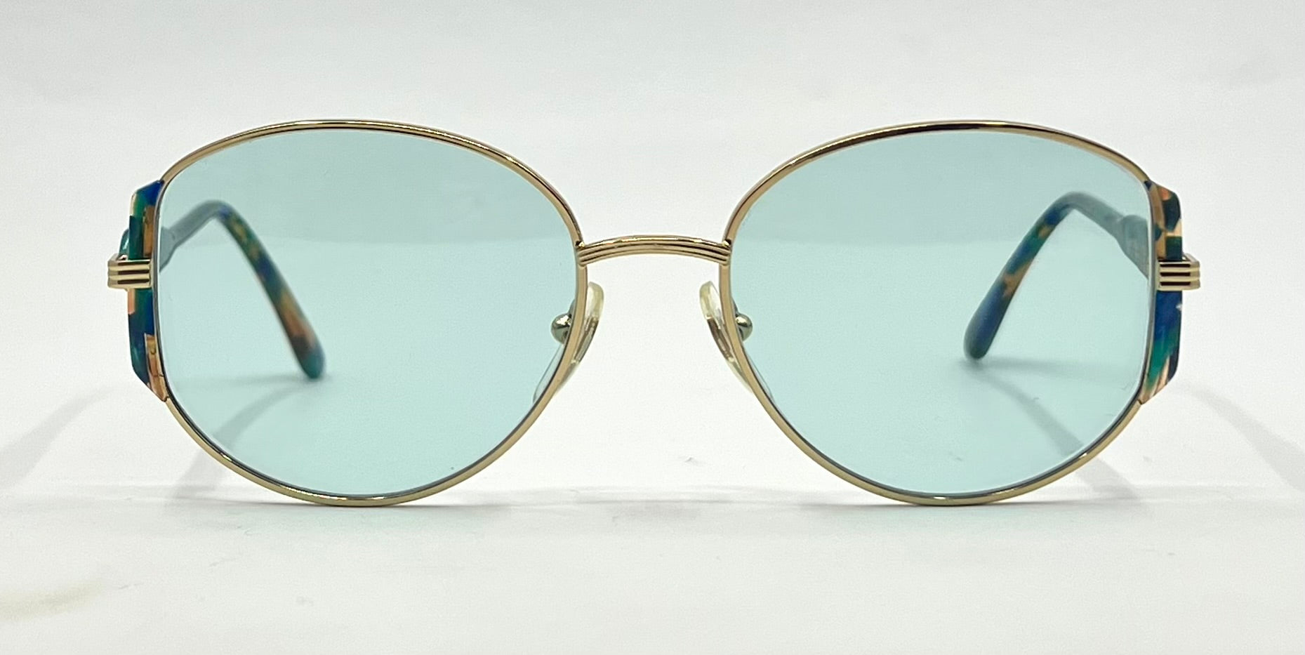 - Color: Gold metal front with multicolor marbled blue/green acetate temples