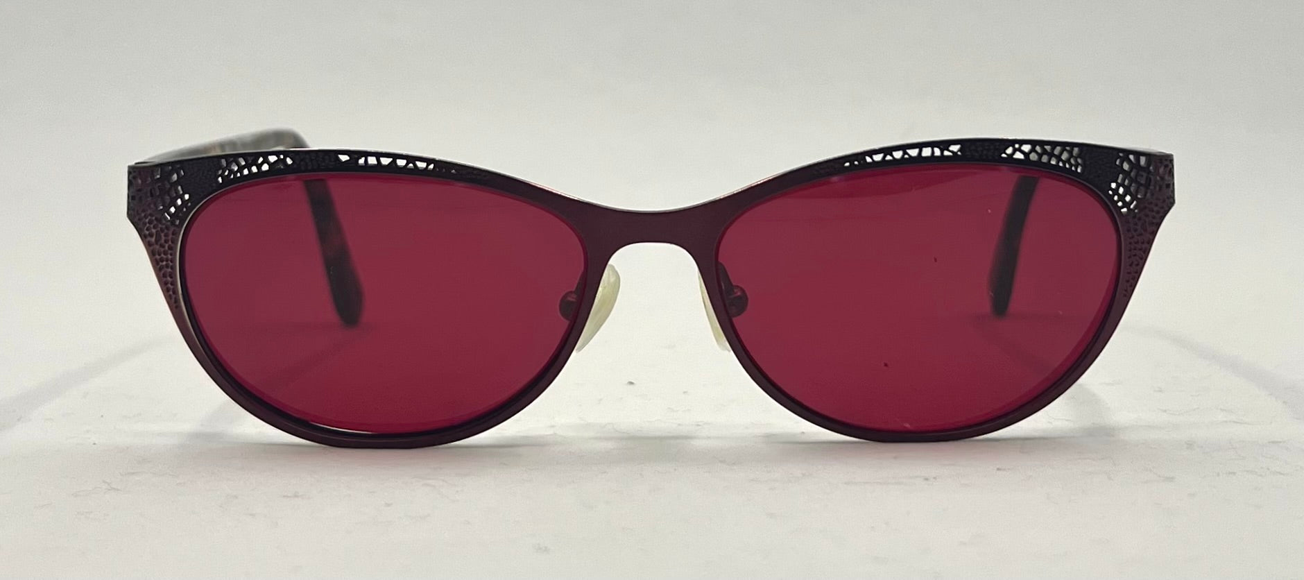 A rare Deadstock / Unworn ProDesign Denmark 3831, featuring a sculpted cat-eye metal front with intricate lace-cut detailing and multitone tortoise acetate temples. This pair has been newly reimagined with Crimson Bloom Second Chance Customs lenses — a rich, warm variation of red that adds bold character while maintaining exceptional clarity and contrast.