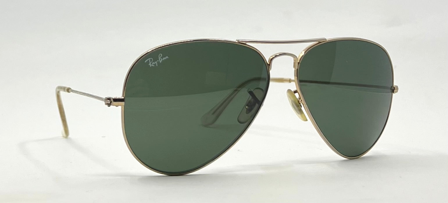This Ray-Ban Aviator Classic RB3025 features the original gold-tone metal frame paired with factory green G-15 glass lenses—the same specification that defined the aviator silhouette for generations. This example is true Deadstock, unworn, and complete with its original full kit.