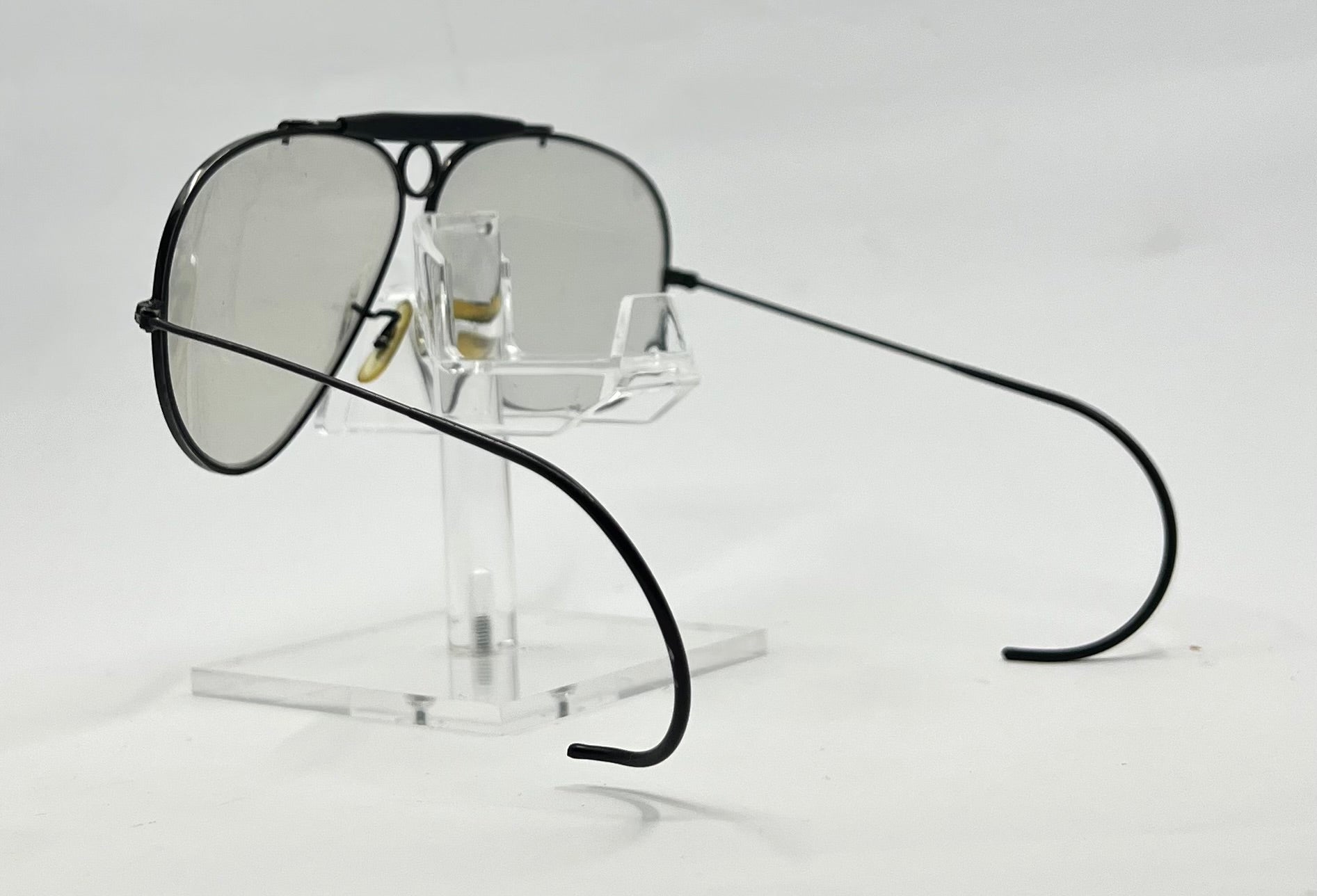 A rare and increasingly collectible Ray-Ban Outdoorsman II variant featuring the unique support-bridge ring beneath the brow bar, paired with classic cable temples and original transitional/photochromic B&L glass lenses. This configuration was produced in limited numbers and remains one of the more distinctive pre-1990 Ray-Ban aviator builds.