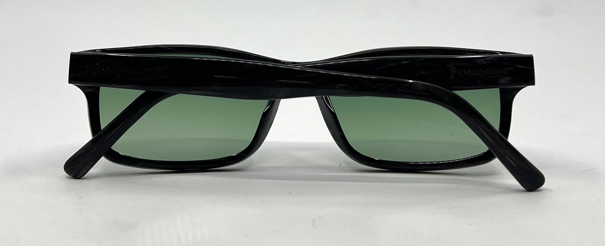 - Ferragamo script logo on temple