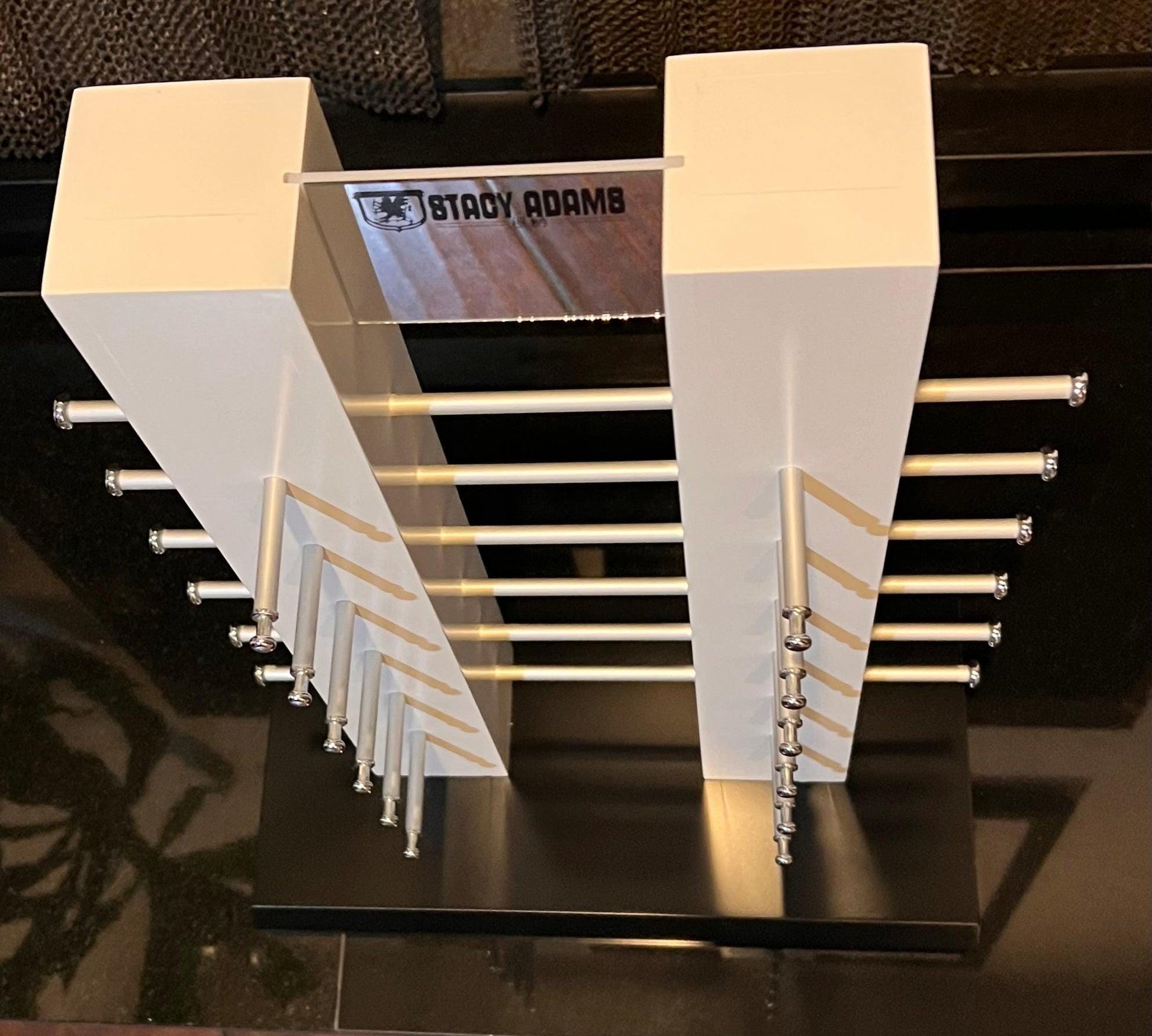 Crafted with quality in mind, this display is the perfect addition to any collector's ensemble. With a timeless white finish and classic Stacy Adams branding, this piece is sure to impress. Don't miss out on the opportunity to showcase your eyewear collection with this stunning countertop display.
