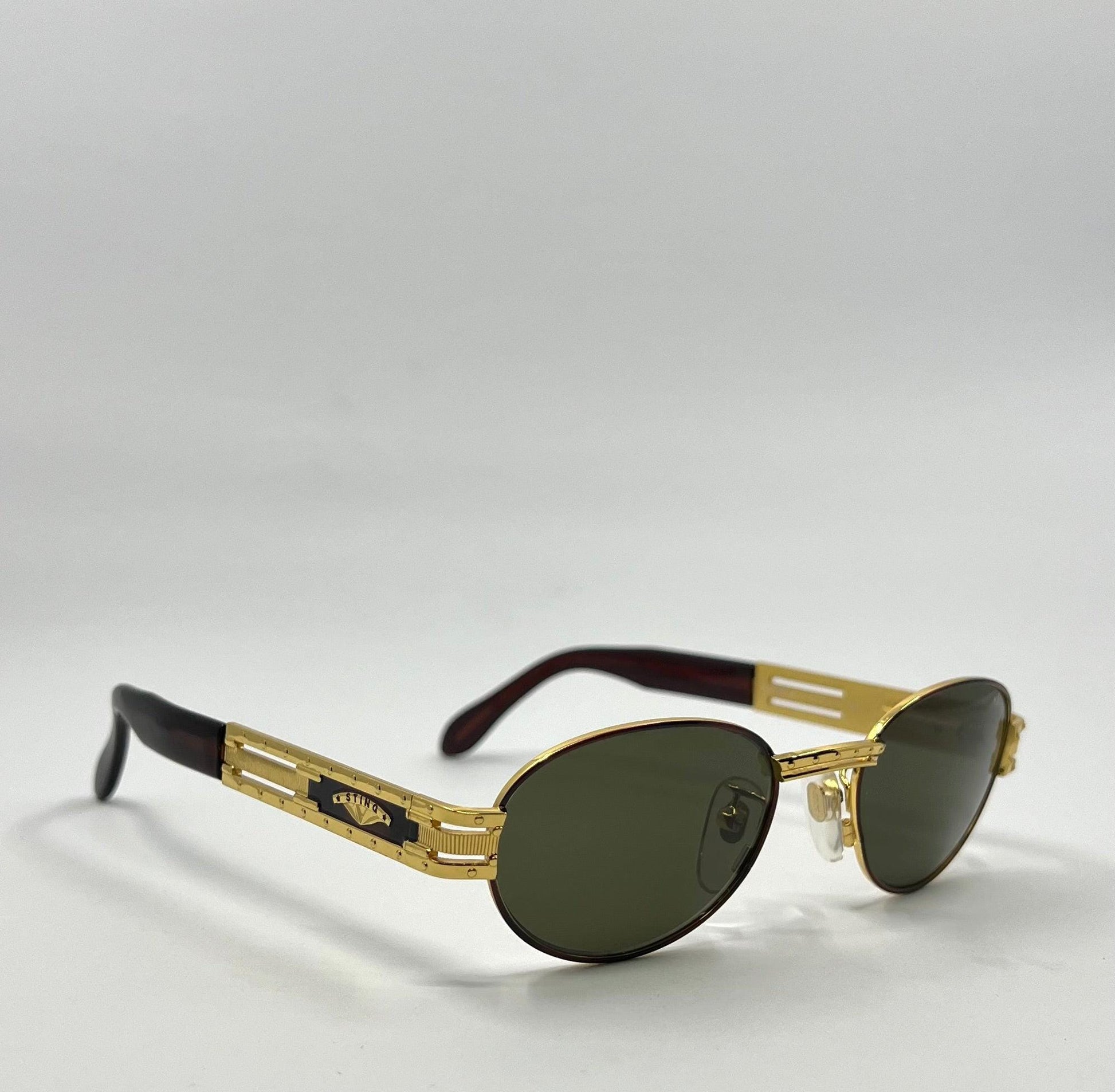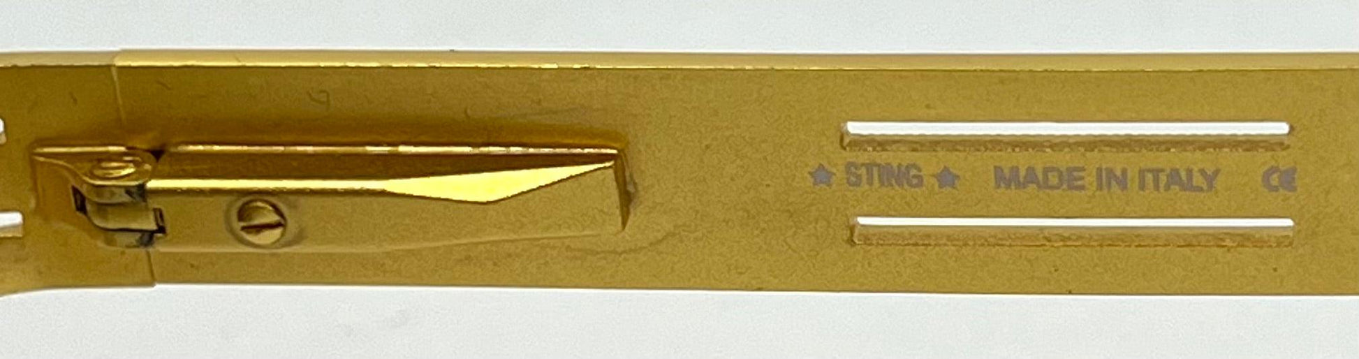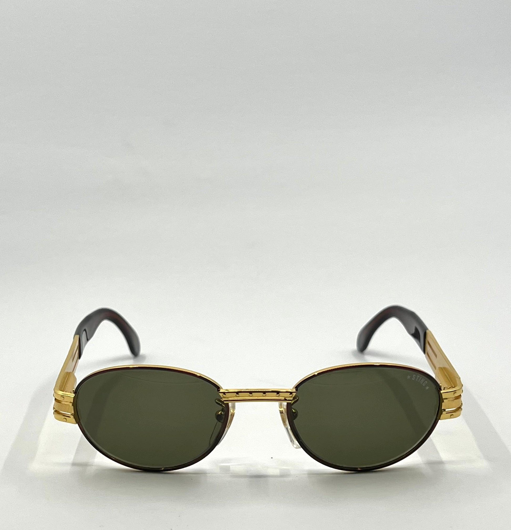 • Style: Oval lens shape with striking gold-plated temples featuring cutout details and embossed STING logo badge. Dark green lenses with original factory etching.