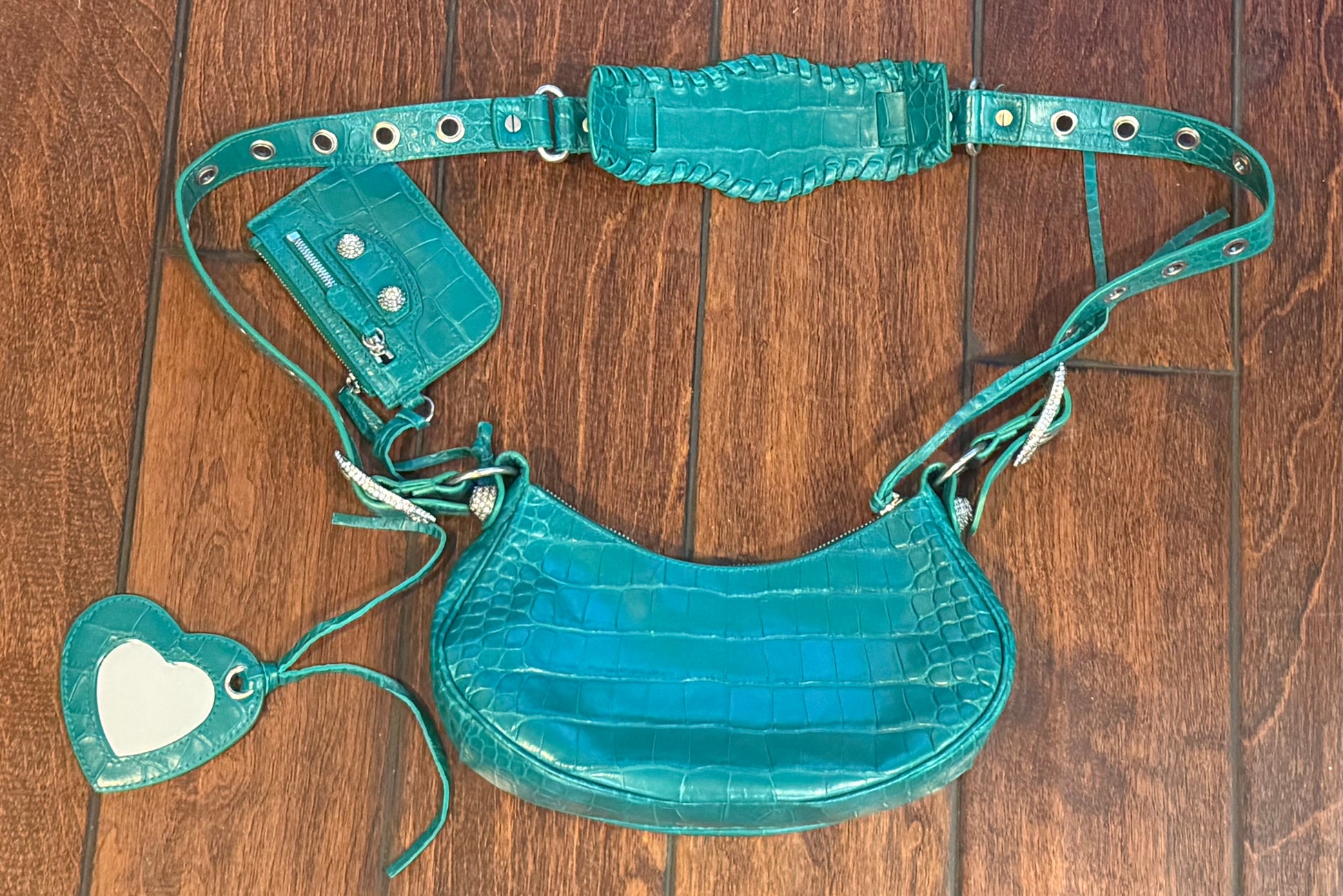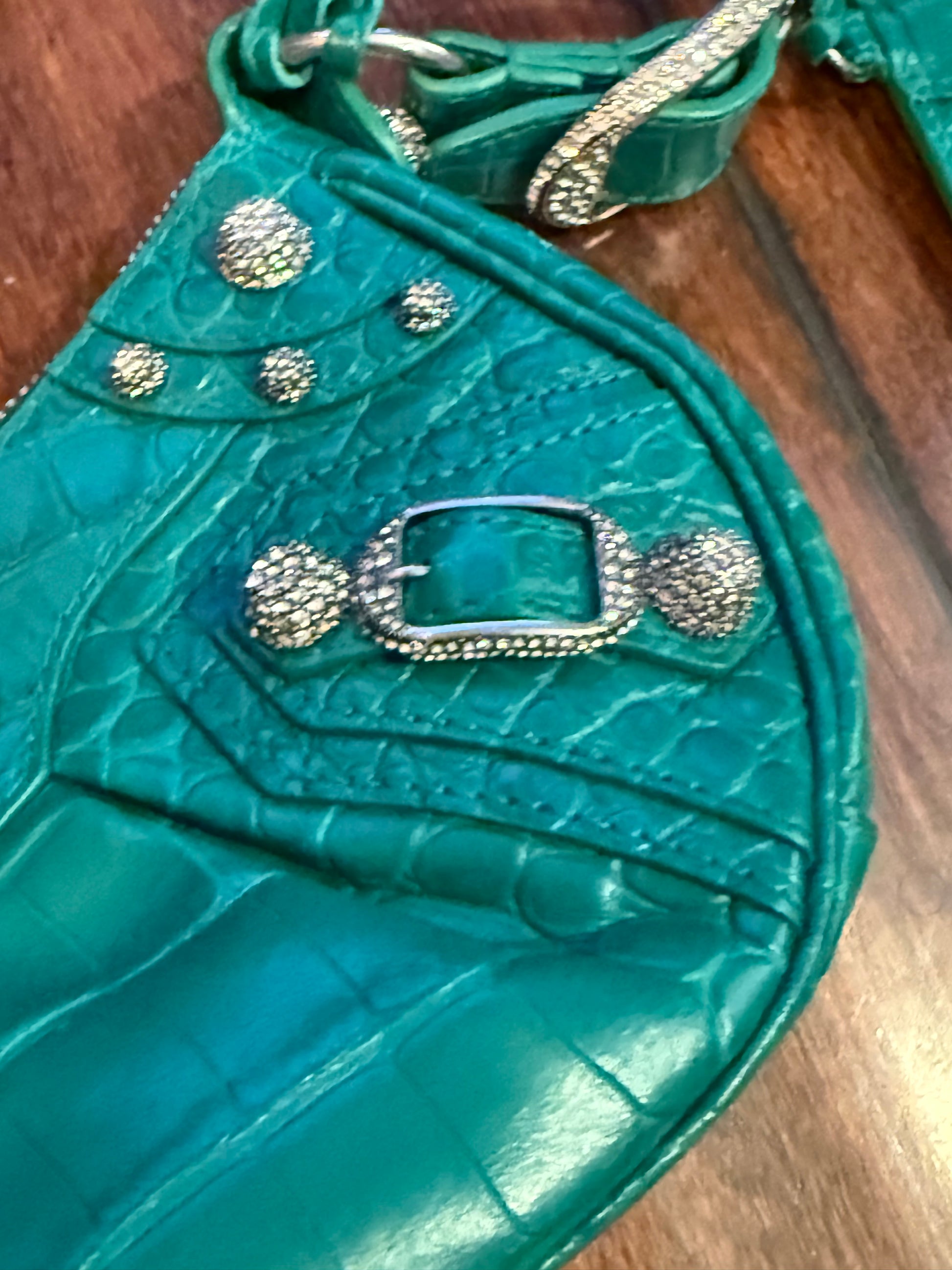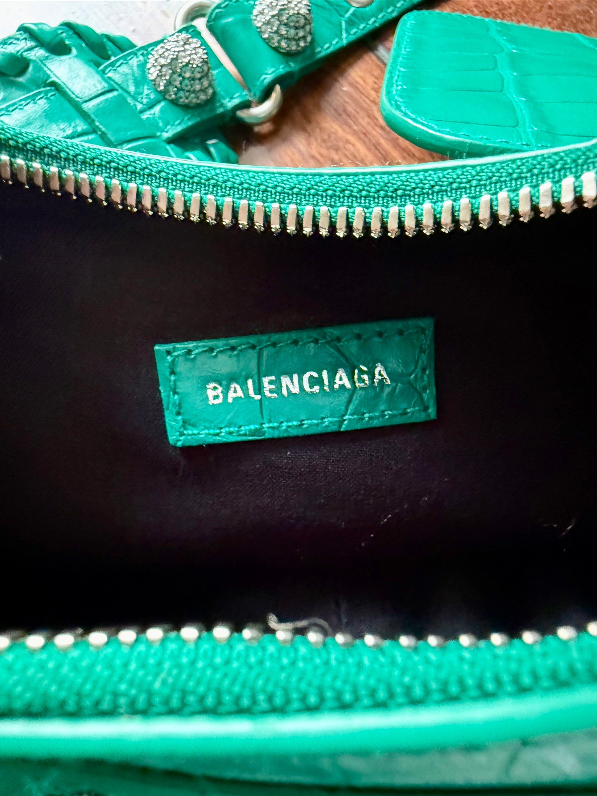 Balenciaga Le Cagole XS Green Croc Embossed Crystal Stud Bag Full Set