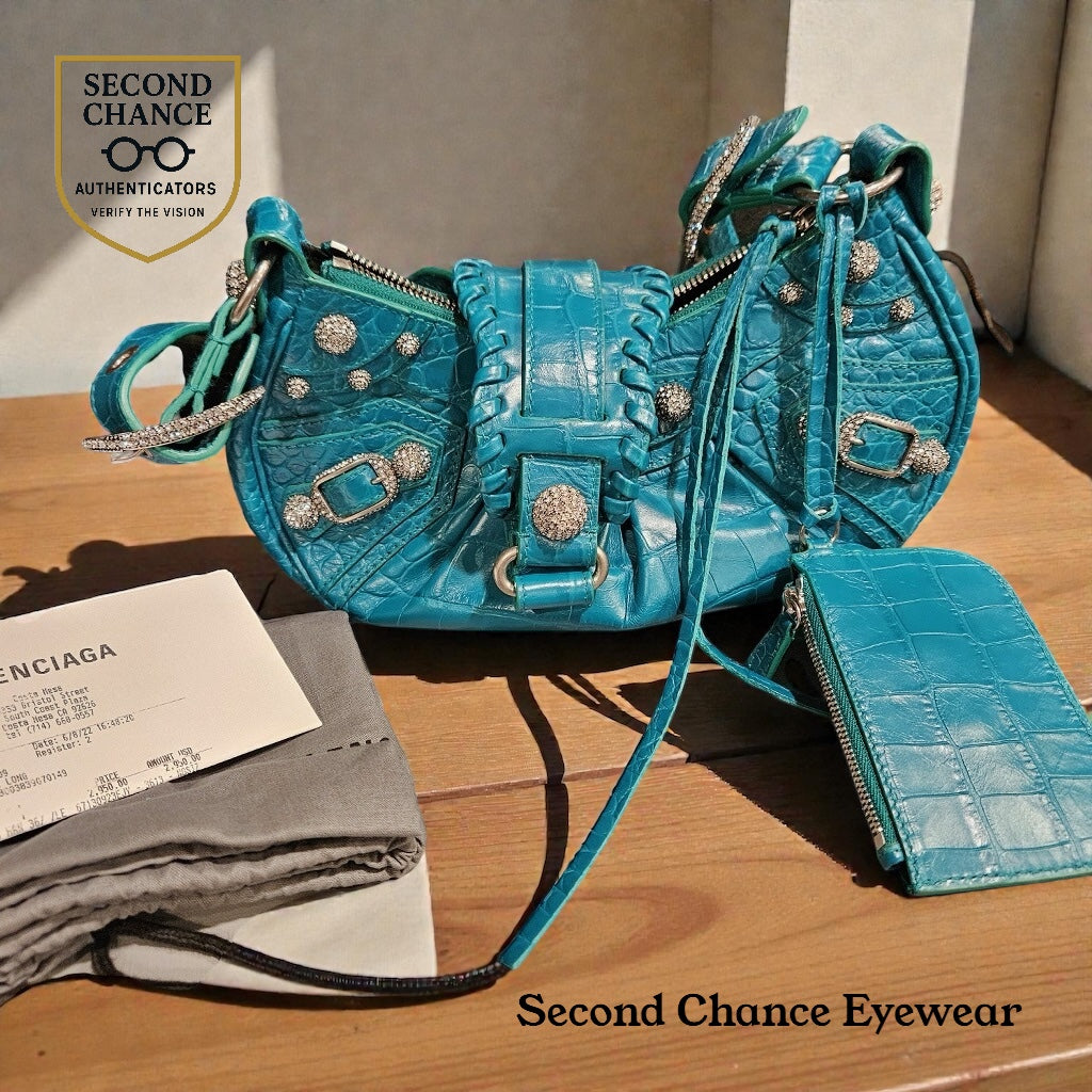 A bold and highly recognizable Balenciaga design, the Le Cagole XS is presented here in green croc-embossed calfskin, finished with crystal (strass) stud detailing and silver-tone hardware. Compact in scale yet visually striking, this piece reflects Balenciaga’s signature blend of edge, craftsmanship, and statement design.