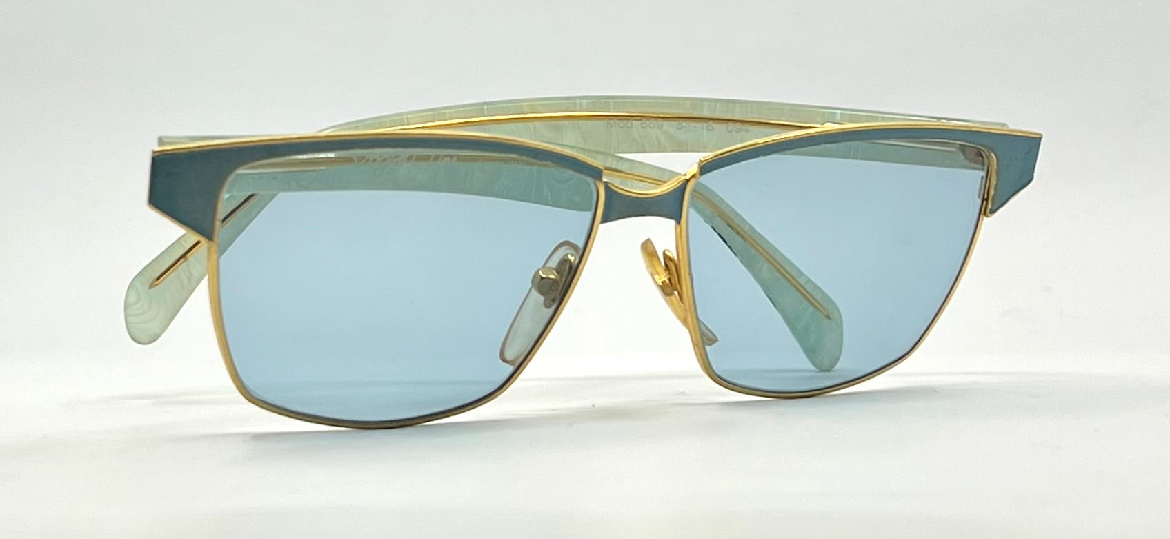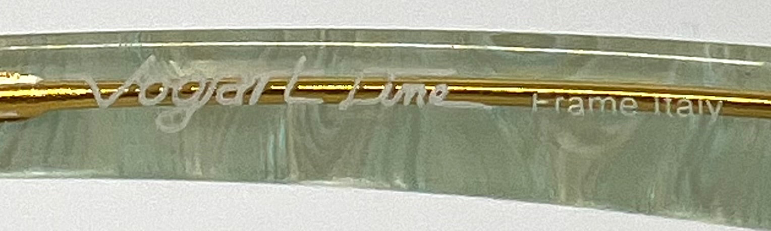 A beautifully preserved vintage Italian Vogart Line frame, offered here in true deadstock condition and fitted with brand new custom lenses. This model showcases exceptional late-80s / early-90s Italian design, highlighted by sculpted acetate temples and elegant gold-tone metal construction.