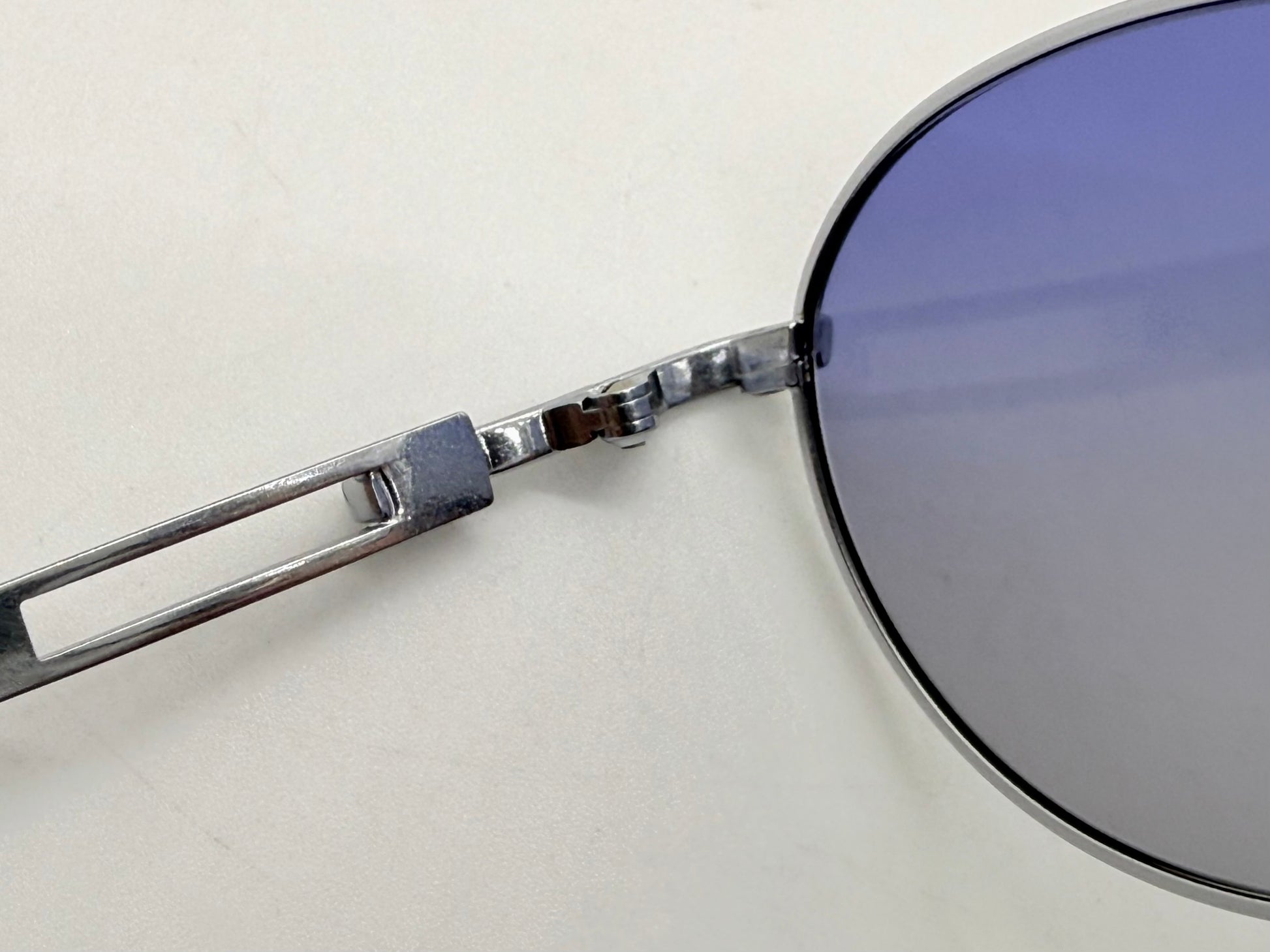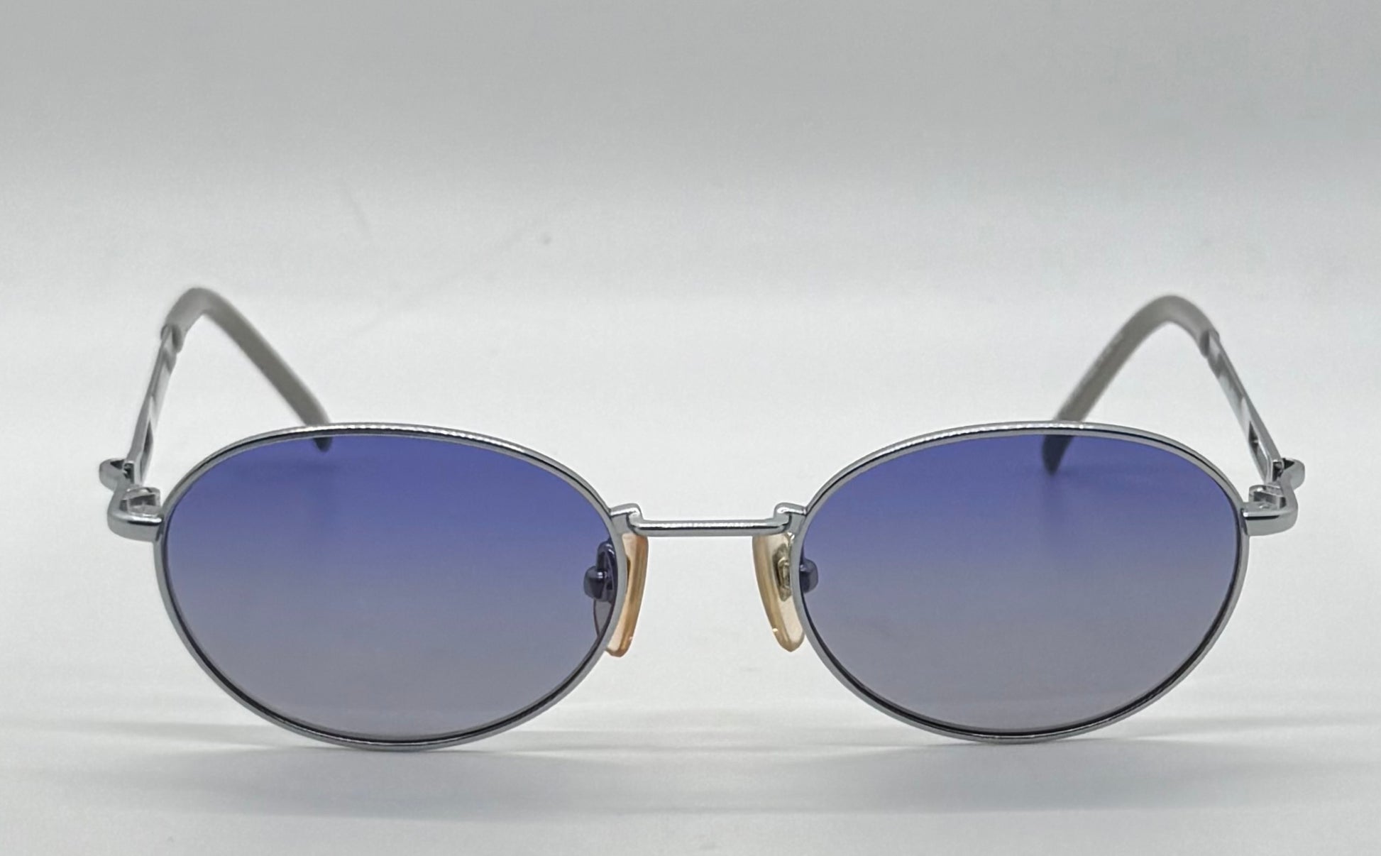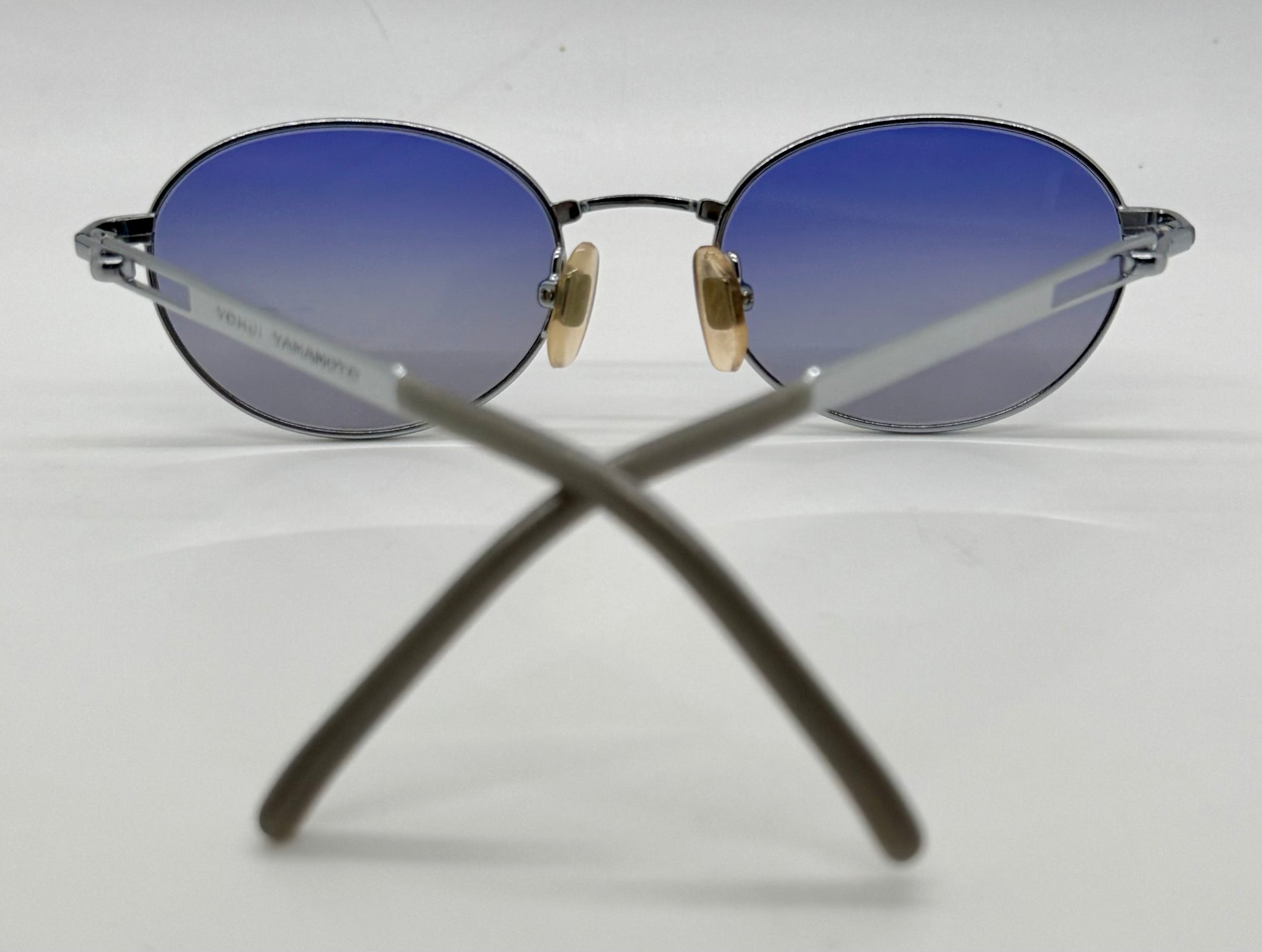An authentic vintage Yohji Yamamoto eyewear piece from the era that defined Japanese designer minimalism. Featuring a refined oval silhouette, silver-tone hand-finished metal construction, and original blue gradient lenses, this pair reflects Yohji’s architectural approach to form and restraint.