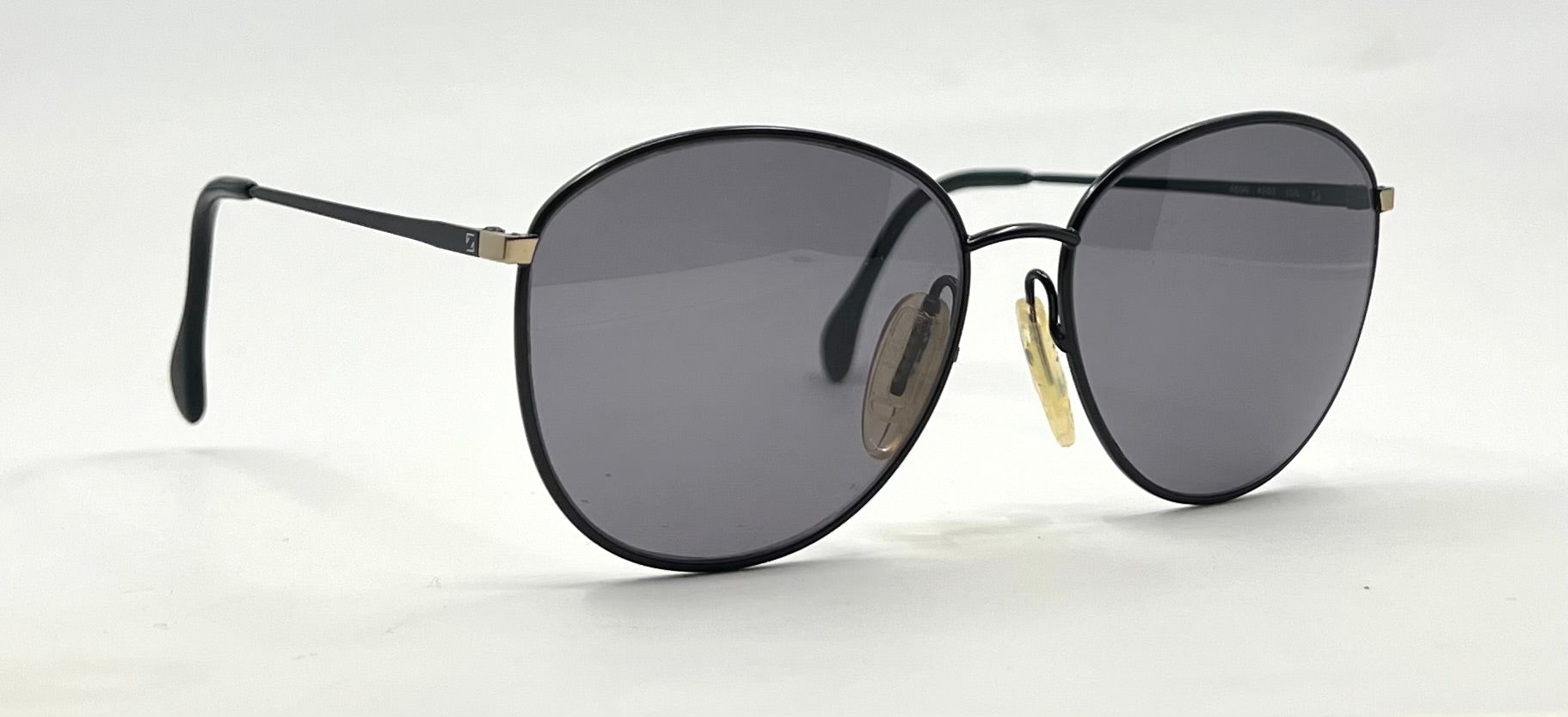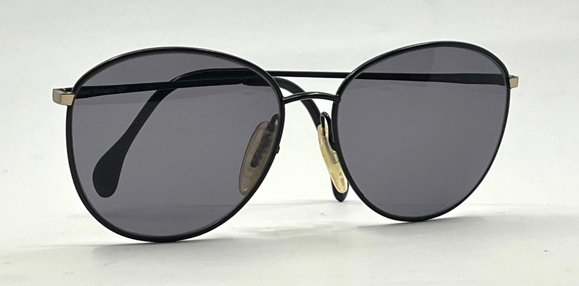 A beautifully preserved pair of vintage Zeiss sunglasses, made in Germany and completely unworn. Thin black metal construction with signature Zeiss minimalist detailing and gold hardware accents. Fitted with brand-new solid black Second Chance Customs lenses, giving this rare frame a modern, crisp finish while maintaining its original Zeiss DNA.